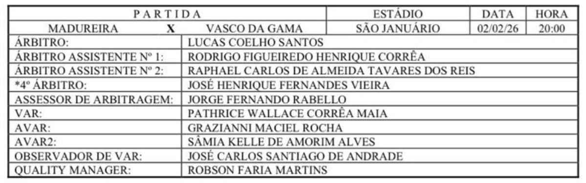 O Madureira enfrenta o Vasco em partida com Lucas Coelho Santos como árbitro principal e Pathrice Wallace Correa Maia no VAR.