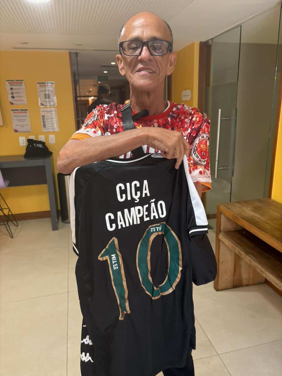 Mestre Ciça, da campeã Viradouro, recebe camisa do Vasco como presente