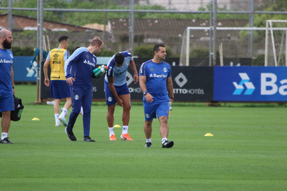 Michel deixa o treino do Grêmio com médico em 2019 — Foto: Eduardo Moura