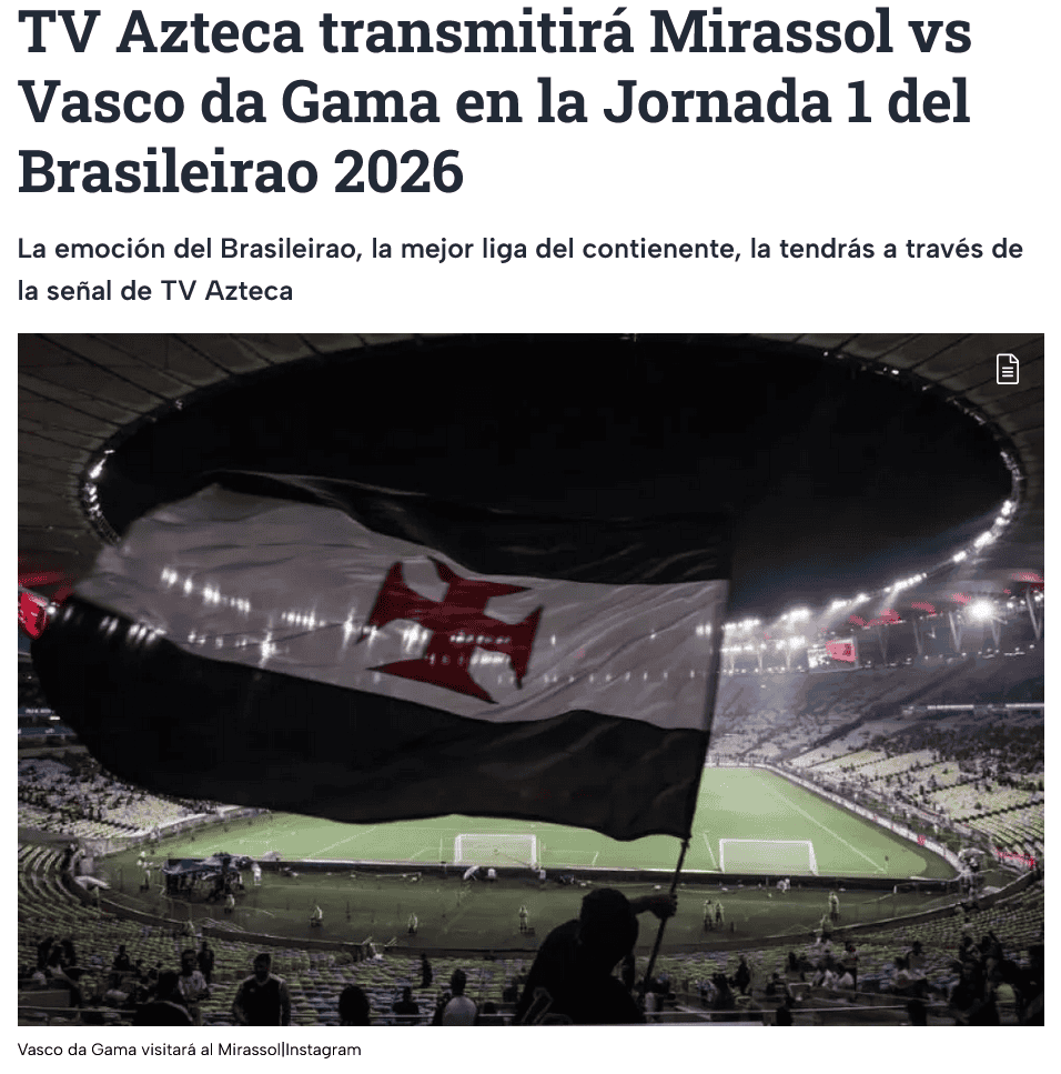 O jogo entre Mirassol e Vasco da Gama será transmitido ao vivo pela TV Azteca Deportes no México.