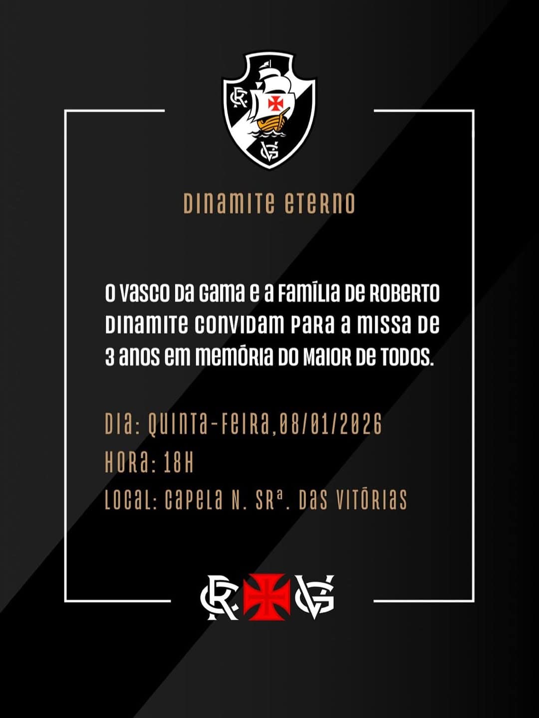 Nesta quinta-feira, 08 de janeiro, às 18h, uma missa será celebrada na Capela N. Srª. das Vitórias, em São Januário, em homenagem à memória de Dinamite. Os torcedores estão convidados a participar da cerimônia.