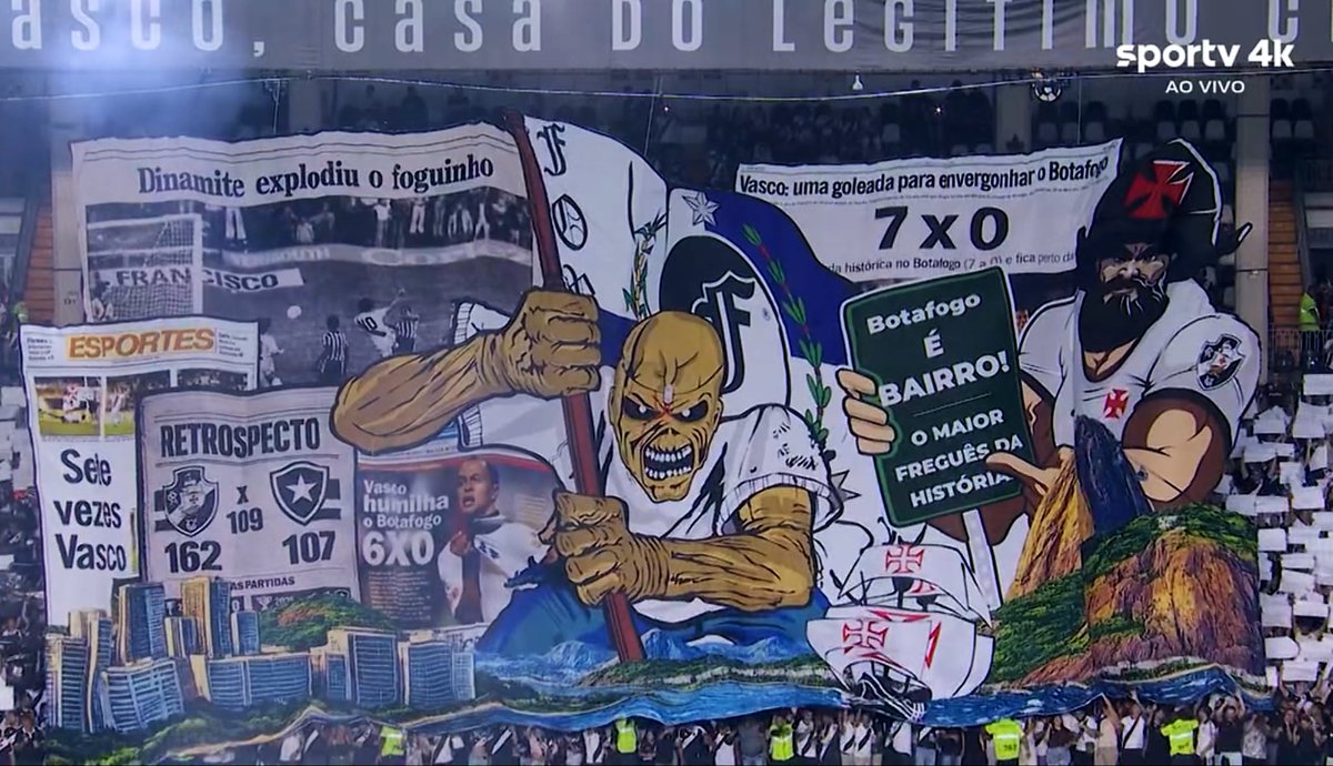 Torcedores do Vasco criam mosaico provocativo ao Botafogo em São Januário.