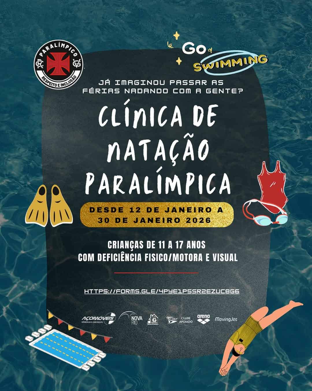 A clínica é destinada a atletas jovens, de 11 a 17 anos, com deficiência física, motora ou visual, que desejam aprofundar seus conhecimentos e habilidades na natação paralímpica, em um ambiente acolhedor.