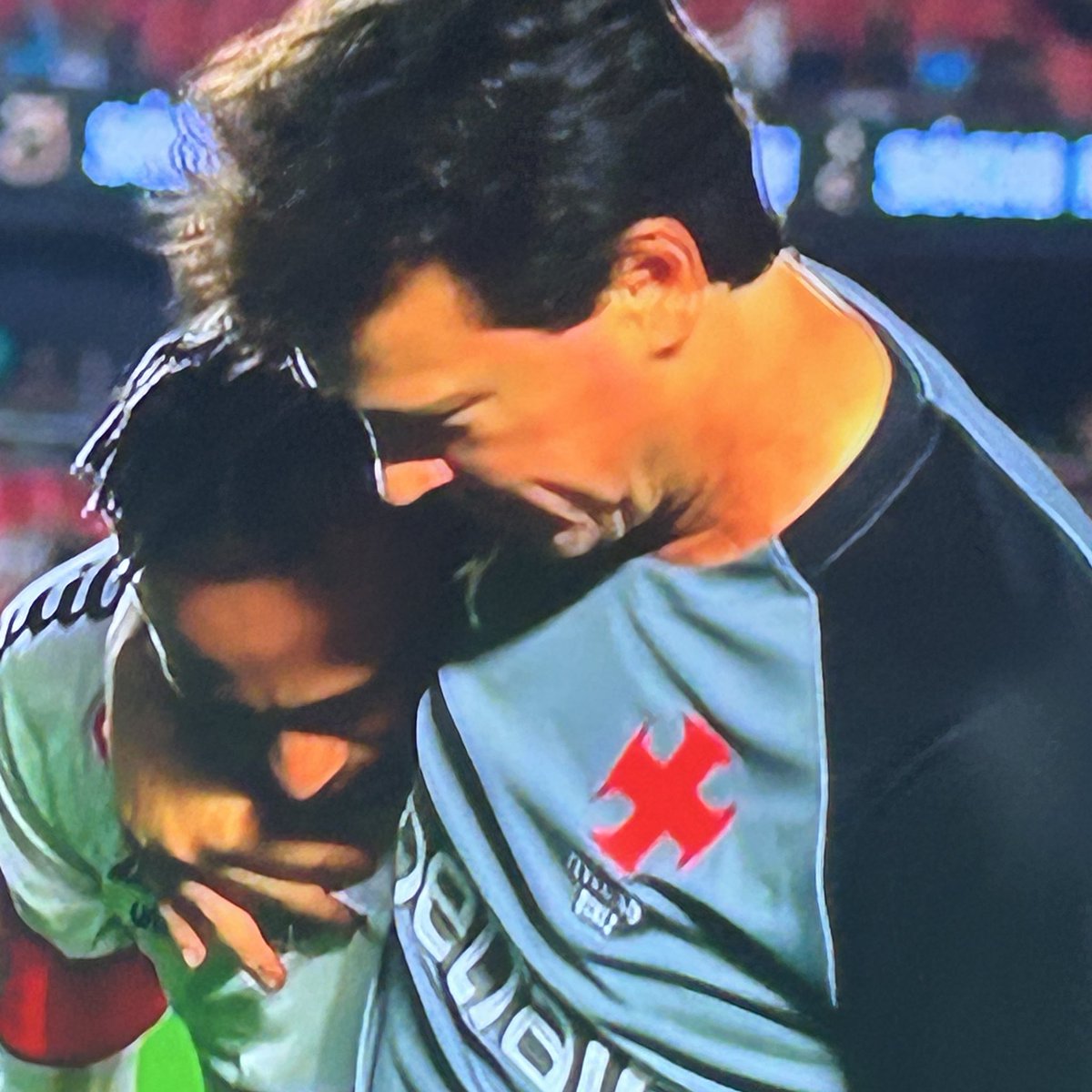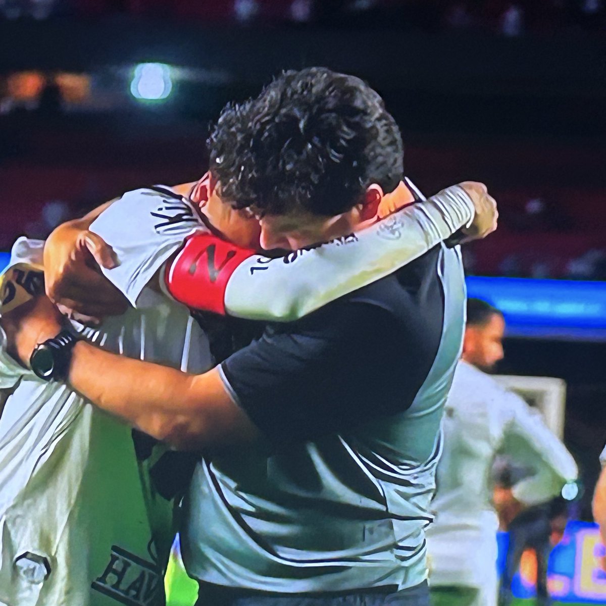Neymar deixa o gramado do MorumBis, visivelmente emocionado, sendo confortado por Diniz.