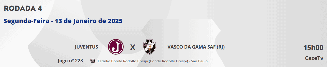 Pela segunda fase da Copinha, o Vasco irá competir contra o Juventus nesta segunda-feira às 15h, na Rua Javari, com transmissão ao vivo pela CazéTV.