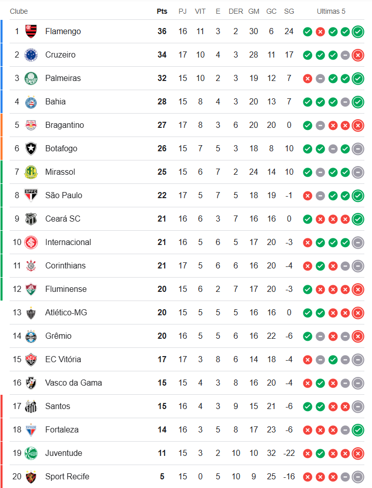 O Campeonato Brasileiro teve uma partida emocionante na ultima terça-feira: Grêmio 2 x 1 Fortaleza. Caso o Fortaleza tivesse garantido a vitória, o Vasco retornaria à zona de rebaixamento. Acompanhe a classificação atual: