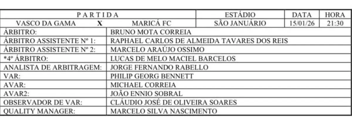 Atenção, torcedores do Vasco! A FERJ anunciou a equipe de arbitragem para a primeira rodada do Campeonato Carioca. Bruno Motta Corrêa será o árbitro da partida entre Vasco e Maricá, enquanto Philipp Georg Bennet ficará responsável pelo VAR. Confira a imagem relacionada: