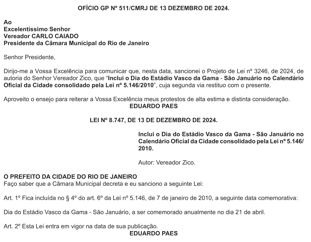 Prefeito Eduardo Paes aprova lei que institui o dia 21 de abril como Dia do Estádio Vasco da Gama – São Januário