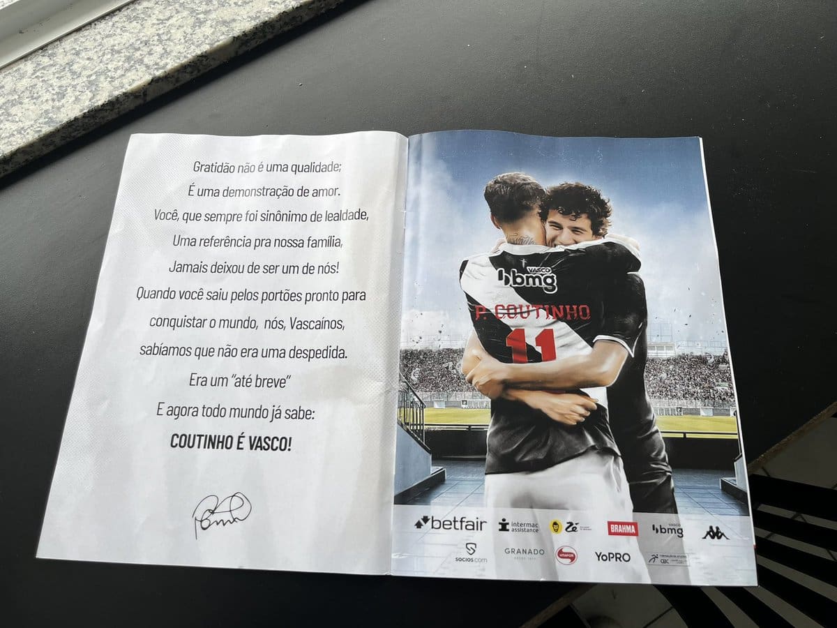 O material preparado pela assessoria de comunicação do Vasco para anunciar a volta de Coutinho está sendo distribuído aos apaixonados pelo clube.