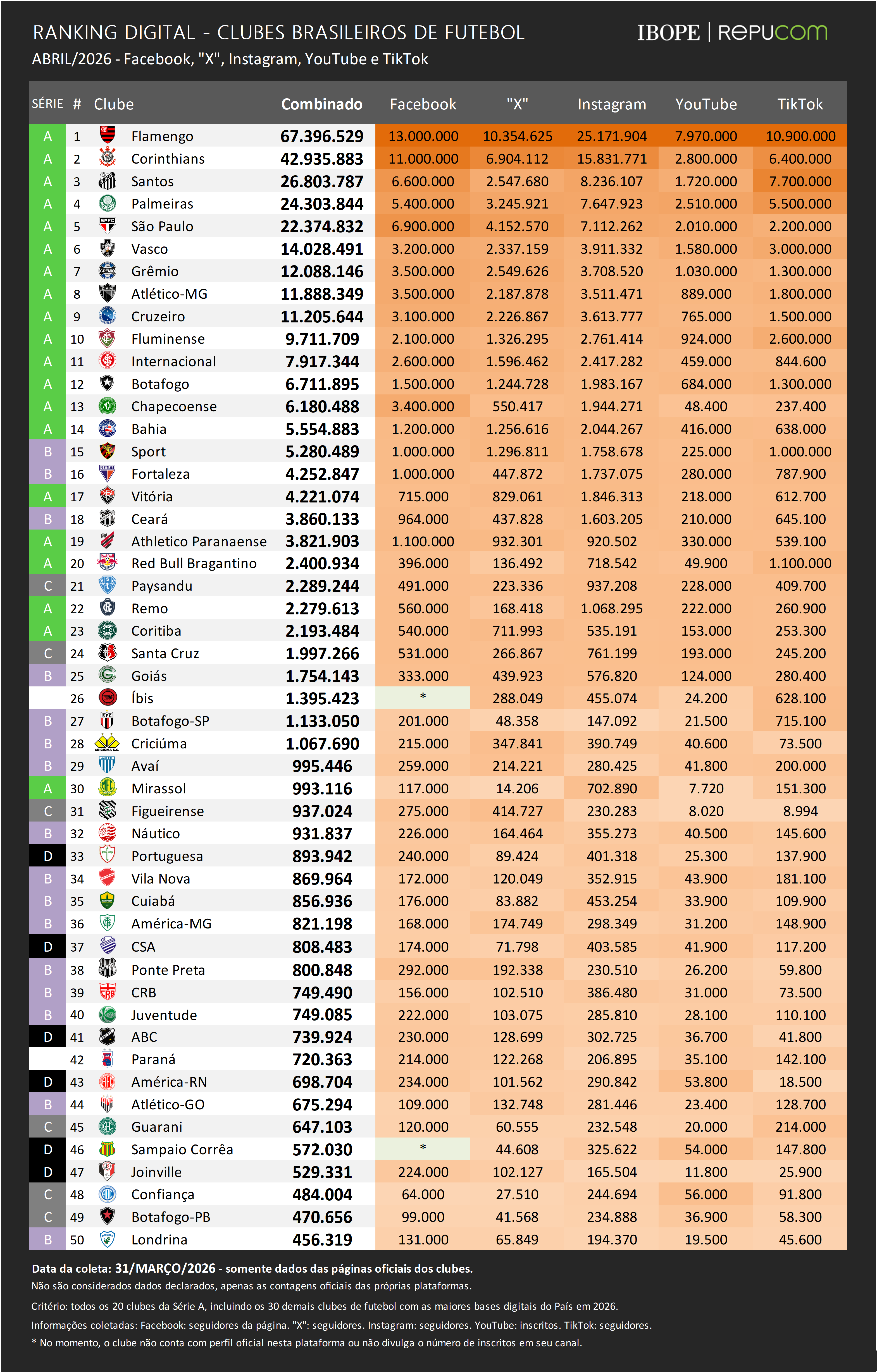 O Santos registrou o terceiro maior crescimento, com 181 mil novas inscrições. O destaque do clube foi no Facebook, onde conquistou 100 mil novos inscritos. Entre os 50 clubes analisados, o Santos foi o que mais somou novas adesões na plataforma em 2026, com um total de 400 mil no primeiro trimestre. No Instagram, o clube da Vila somou 71 mil seguidores em março.
