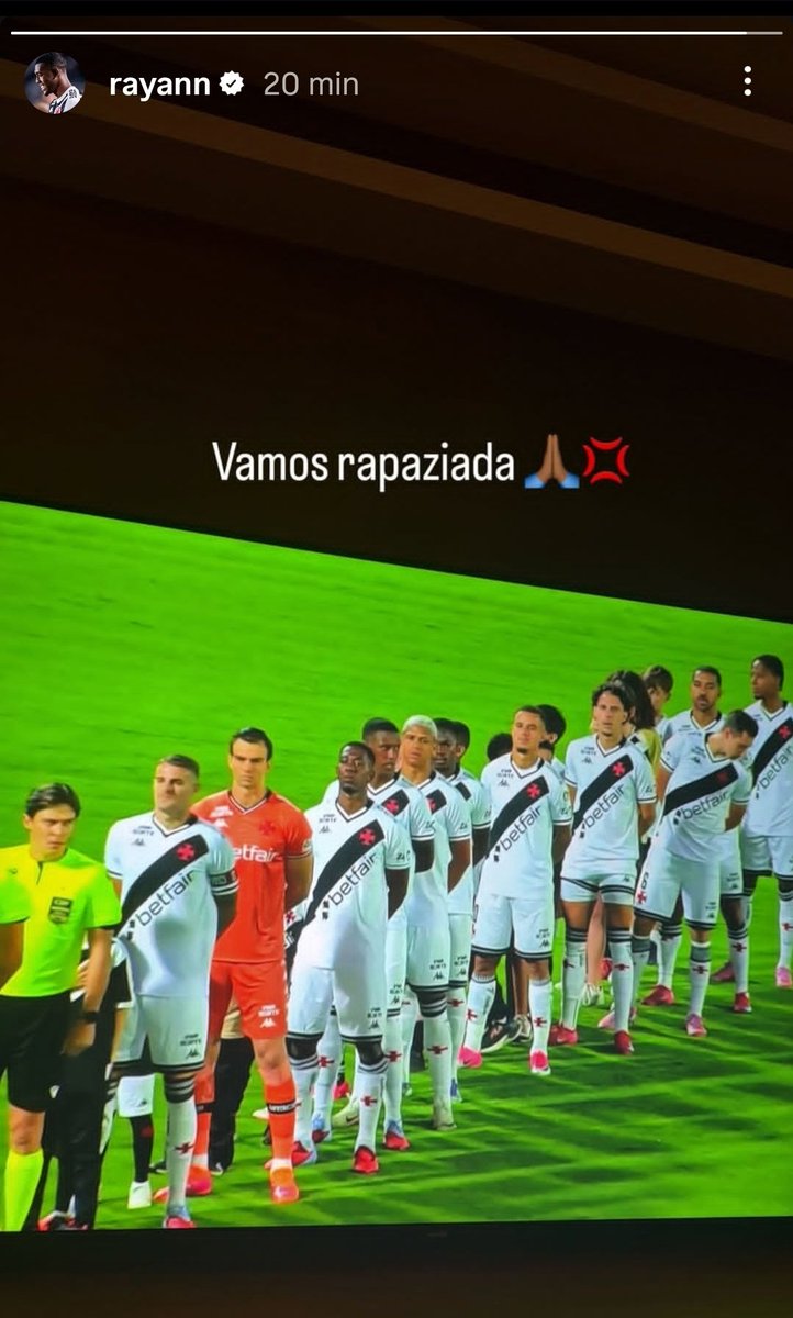 O atacante Rayan, que não pôde atuar na partida devido a uma lesão muscular na coxa, está acompanhando de perto o confronto entre Vasco e Bragantino e compartilhou uma postagem nas redes sociais.