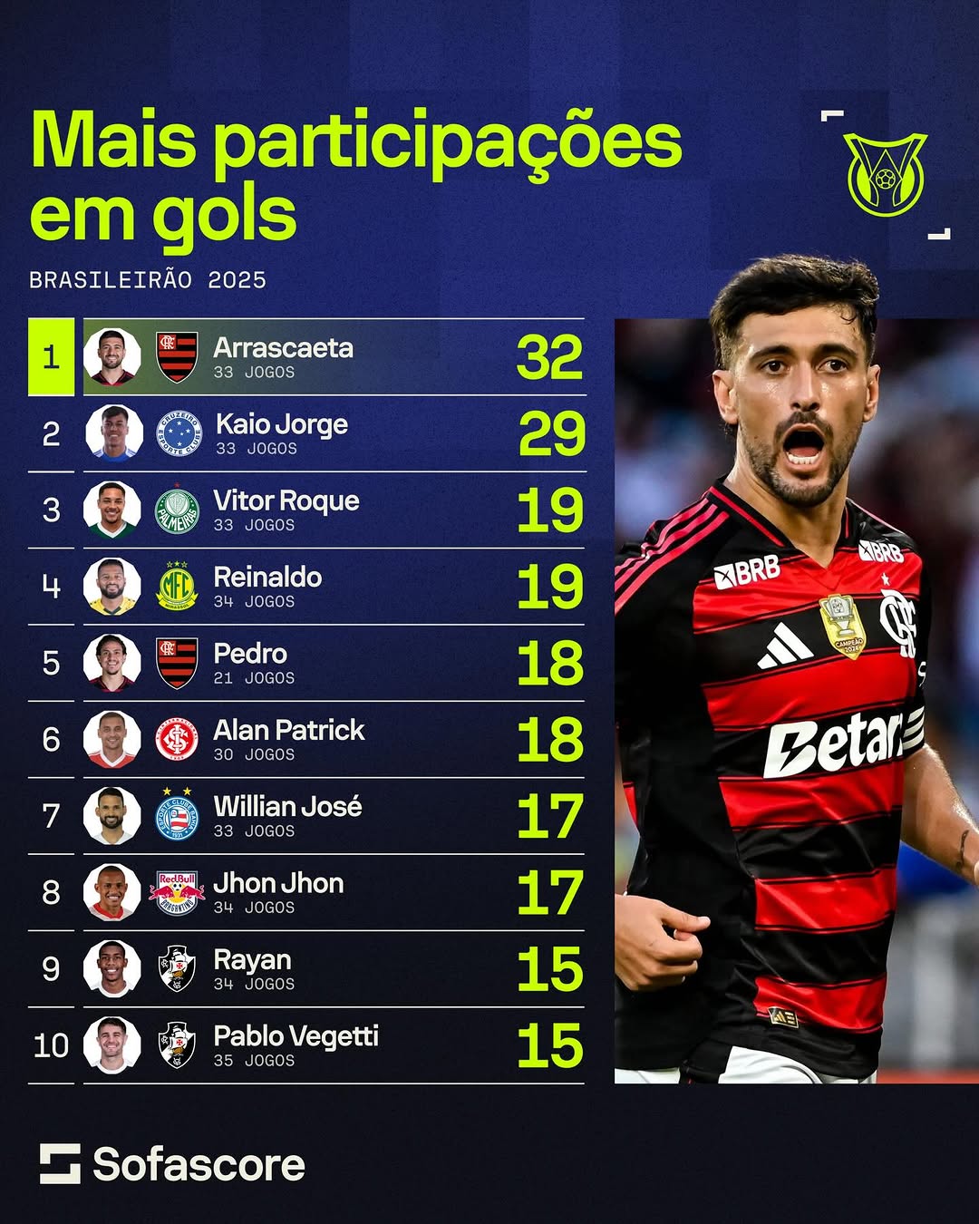 Rayan e Vegetti fazem parte do top 10 de contribuidores para gols do Brasileiro 2025