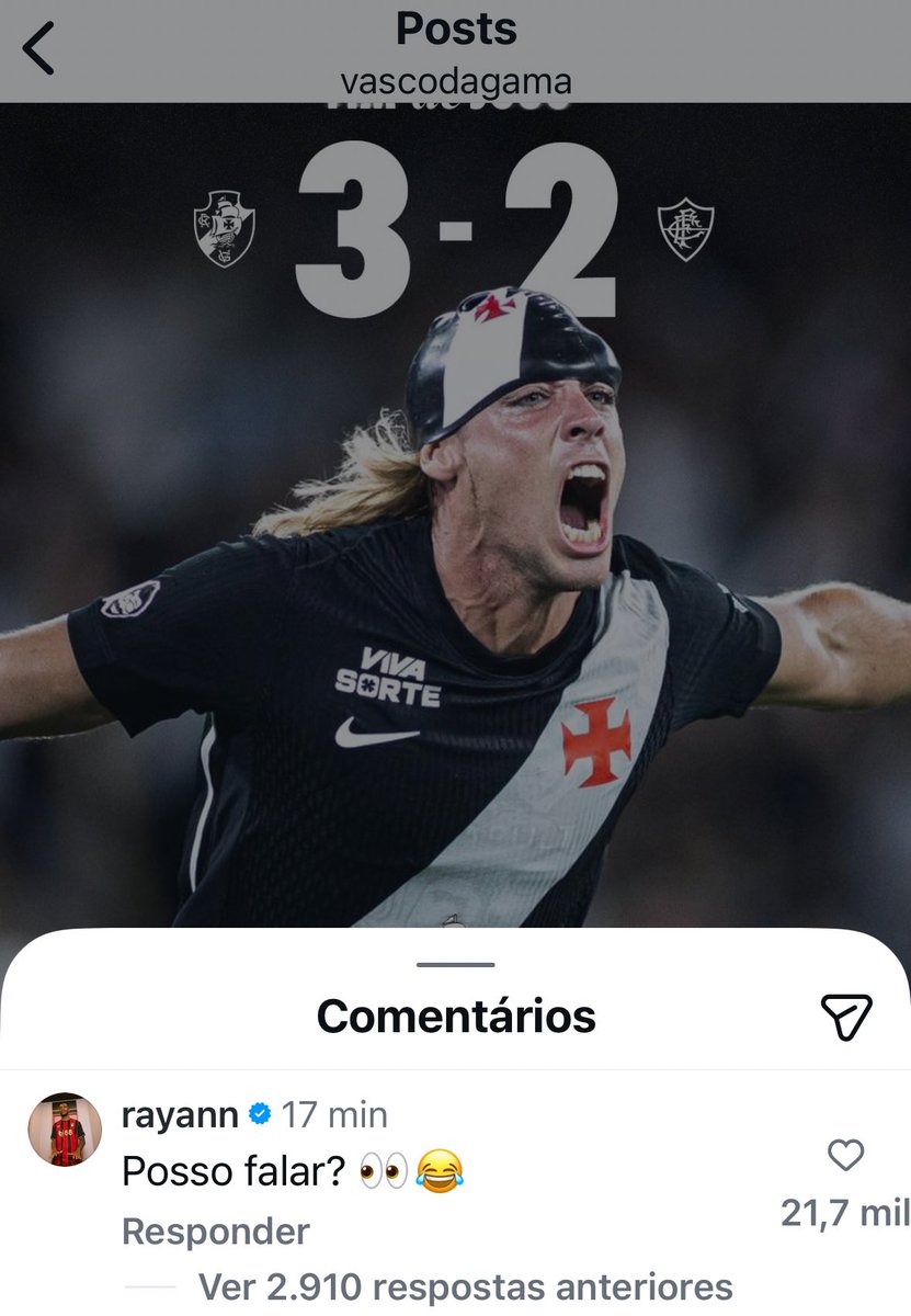 Rayan comentou em publicação do Vasco celebrando vitória sobre o Fluminense.