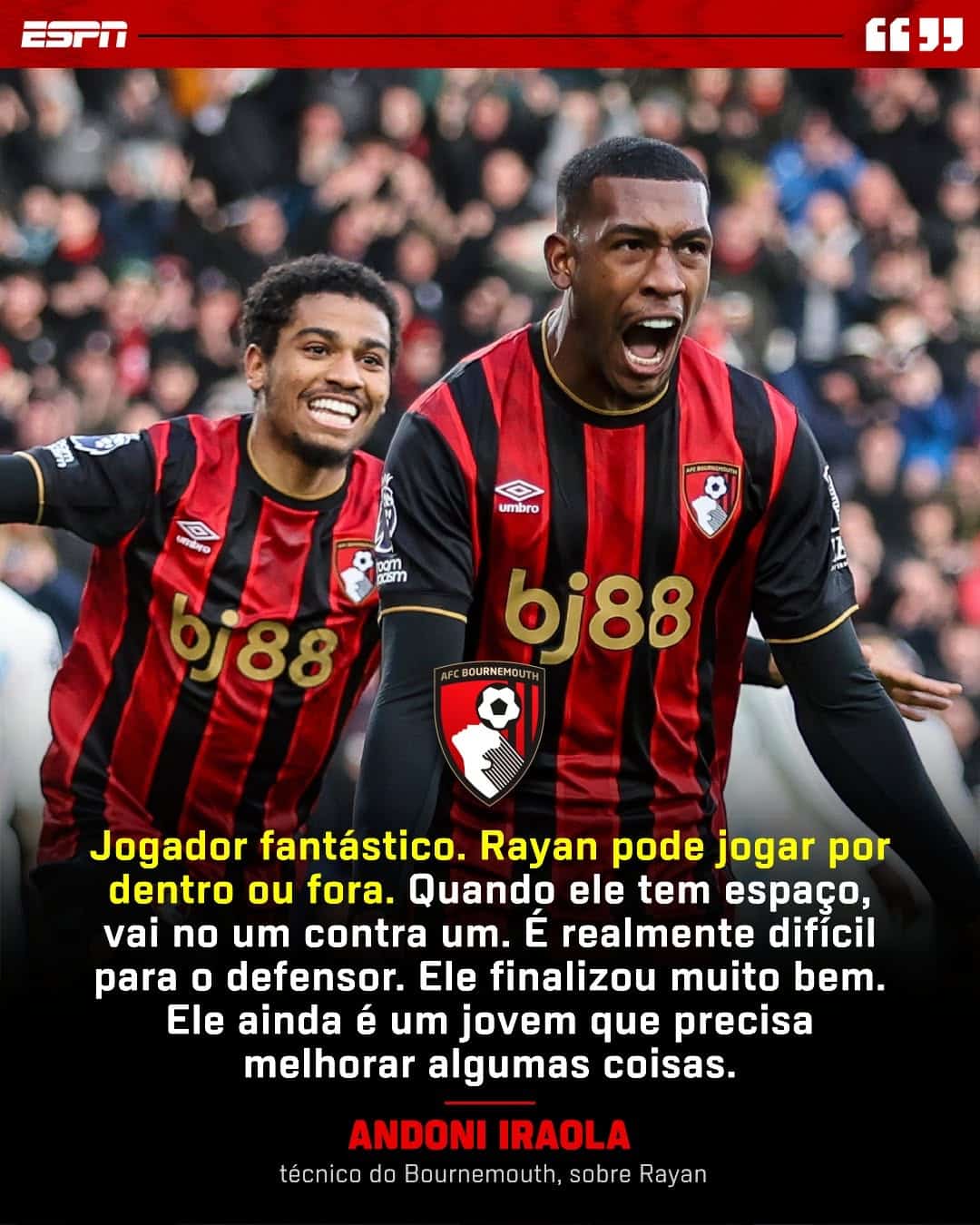 Andoni Iraola, técnico do Bournemouth, elogiou Rayan, destacando suas qualidades como um jogador fantástico, versátil e difícil de marcar quando possui espaço. Apesar dos louvores, Iraola ressaltou que o jovem ainda tem potencial para evoluir em certos aspectos.