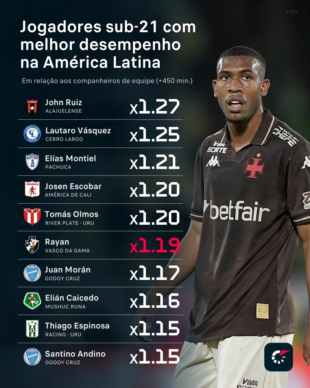 O Observatório Internacional do Futebol (CIES) revelou os jogadores Sub-21 com desempenho mais destacado em relação aos colegas na América Latina, e Rayan, do Vasco da Gama, figurou entre os 10 melhores da lista. 😍