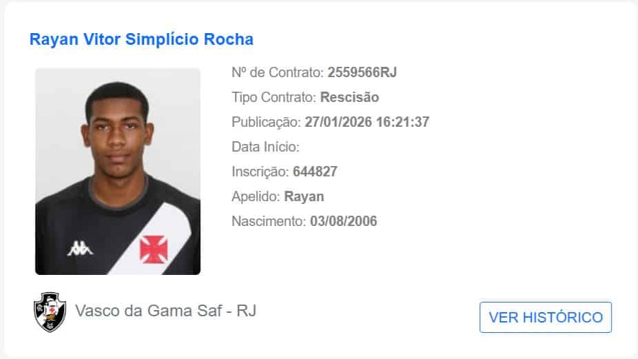 O jogador Rayan teve sua rescisão contratual oficializada no Boletim Informativo Diário da CBF, encerrando sua passagem pelo Vasco da Gama.