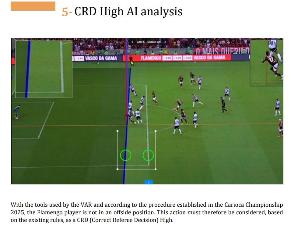 O relatório considera uma análise meticulosa de todas as decisões da arbitragem durante o confronto. Referente ao gol de Bruno Henrique, a verificação através de inteligência artificial indica que o lance é legítimo. De acordo com o relatório, que está em inglês, “utilizando as ferramentas do VAR e seguindo o protocolo do Campeonato Carioca, o atleta do Flamengo estava em posição legal e o lance deve ser avaliado como de alto grau de dificuldade para a tomada de decisão do árbitro”. O juiz que comandou a partida foi Wagner do Nascimento Magalhães, com Paulo Renato da Silva Coelho atuando como VAR principal.