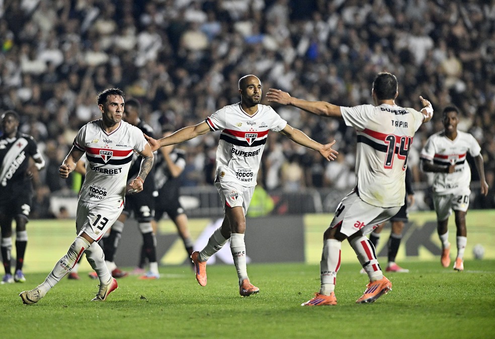 Lucas comemora gol do São Paulo contra o Vasco — Foto: André Durão