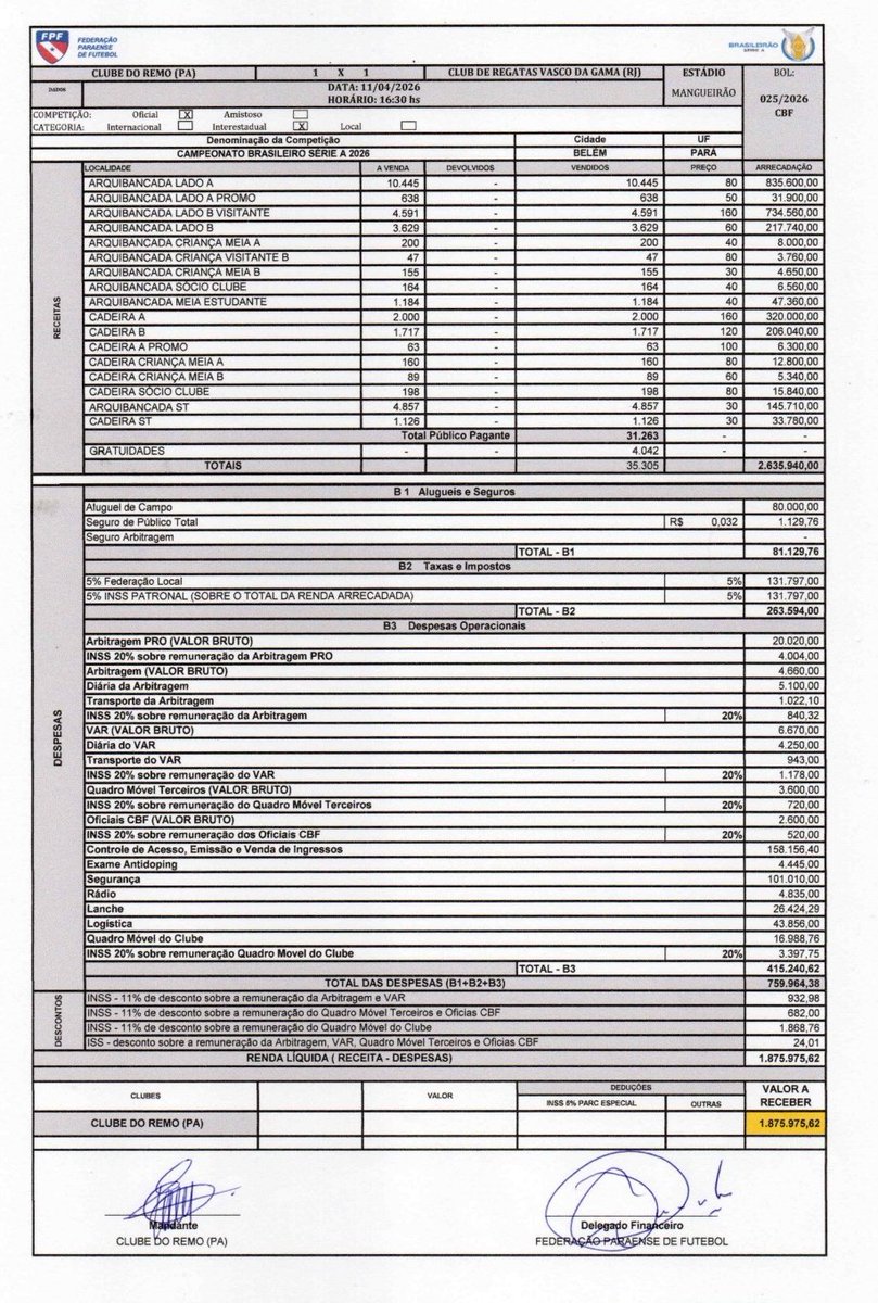 Renda e público do Clube do Remo 1 x 1 Vasco da Gama, no Estádio Mangueirão, pela 11ª rodada da Série A do Campeonato Brasileiro.