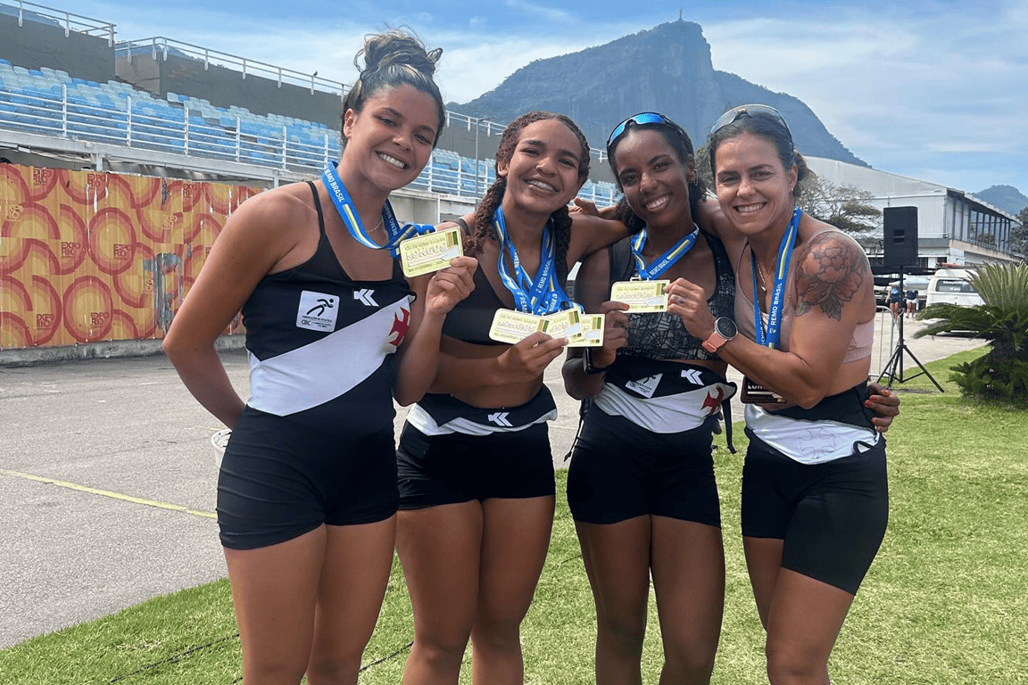 Kauanne Alves, Maria Eduarda, Kaylane Cristine e Fernanda Nunes, medalhistas no Campeonato Brasileiro de Barcos Longos de Remo em 2025. Foto: Instagram da remadora Kauanne Alves