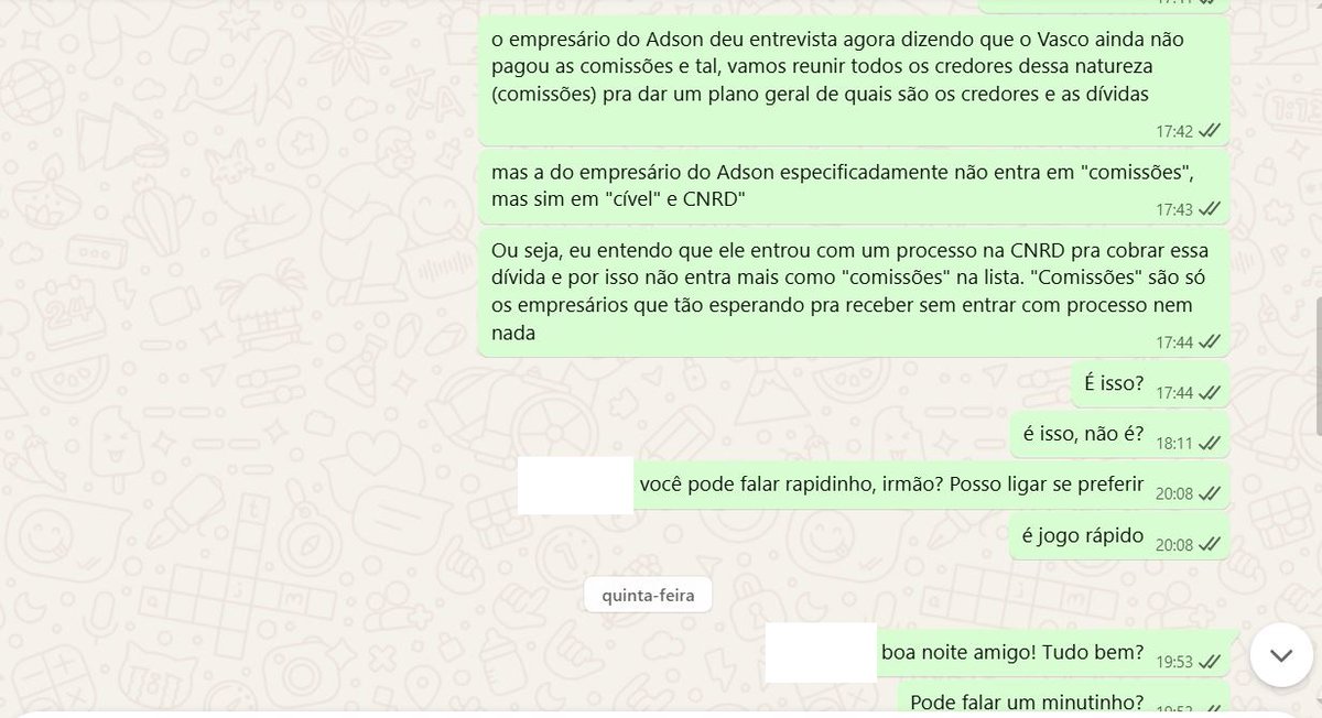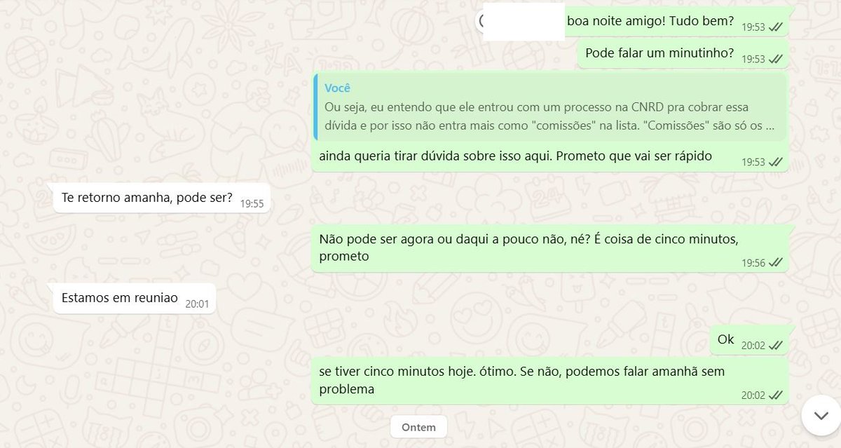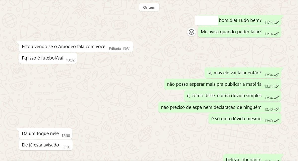 Essa foi a conversa que tive com um membro da diretoria. Inicialmente, o objetivo era esclarecer apenas uma dúvida. Entre o primeiro e o último print, há uma diferença de cinco dias.