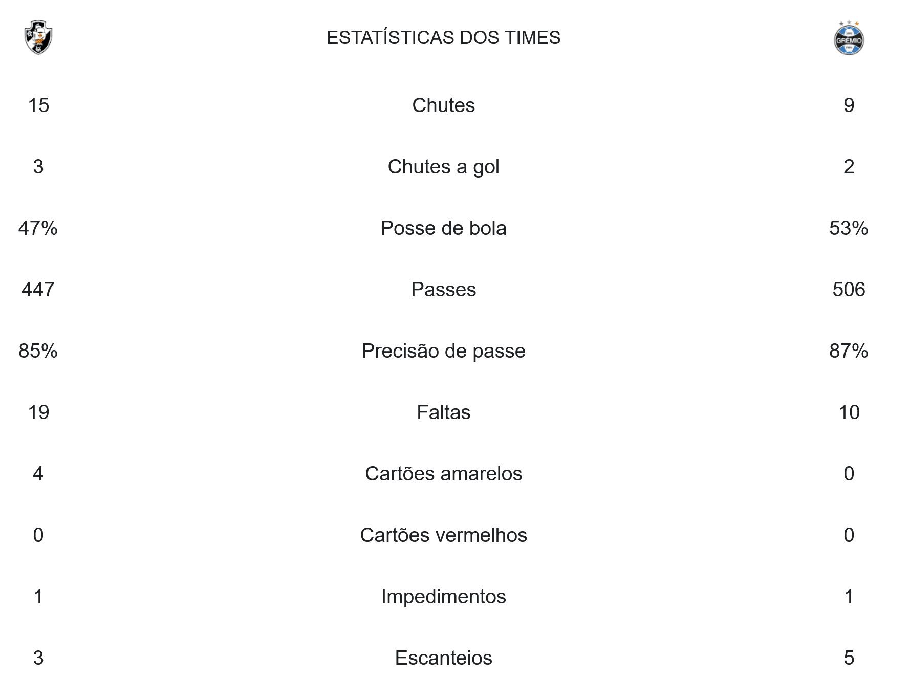 MeuVasco › FutebolResultado da partida entre Vasco 2 e 1 Grêmio domingo, 14/04/2024 às 18:31 Imagem: googleFonte: Google Futebol Receba notícias do Vasco Cadastre seu e-mail para receber os principais destaques do Vasco. Seu e-mail Quero receber Você pode cancelar a inscrição quando quiser. Relacionados Com planos, Bournemouth ajusta detalhes finais para anunciar Rayan Flamengo respira no Carioca ao vencer o Vasco com equipe titular. Após a vitória no clássico, Bruno Henrique destaca o empenho do elenco do Flamengo. Mercado da Bola: acompanhe as atualizações deste domingo, 11 de janeiro. Campeonato Carioca: descubra todos os detalhes da edição 2026 do Estadual