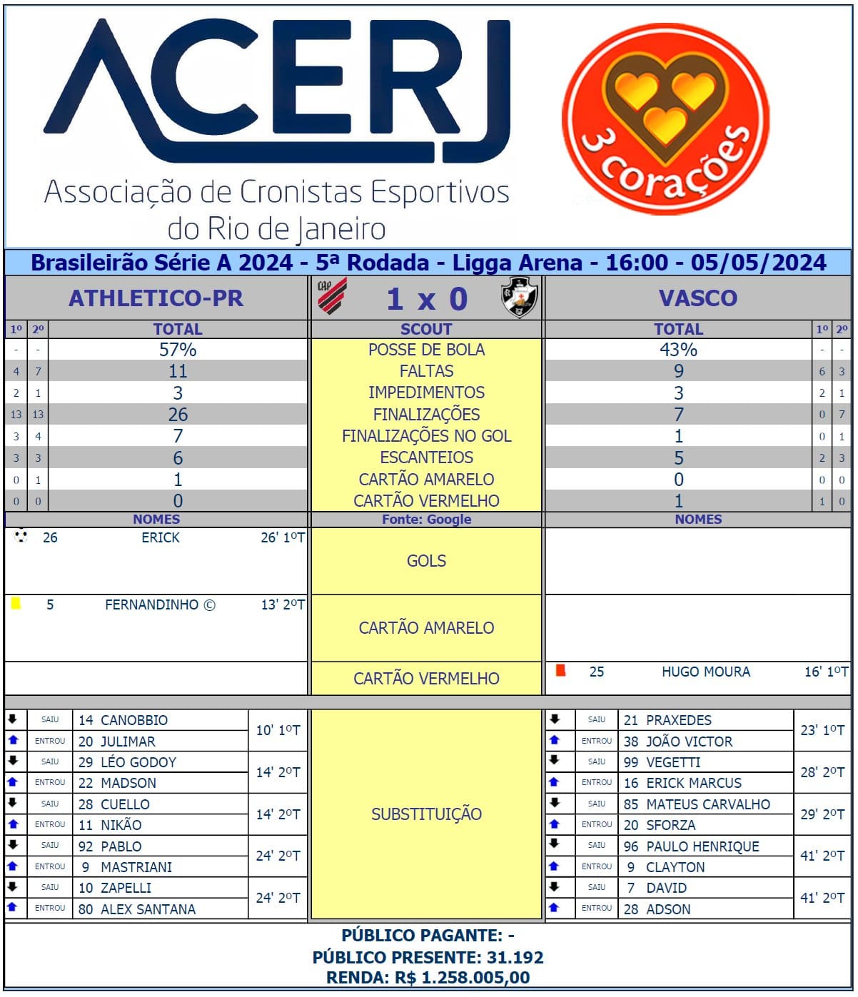 Confira detalhes do desempenho de Athletico-PR e Vasco durante a 5ª Rodada do Campeonato Brasileiro 2024, realizada na Liga Arena, conforme informações do Google. A partida teve como vencedor o time do Athletico-PR. #Acerjinforma #brasileirao2024 #CAPxVAS #AthleticoPR #Vasco