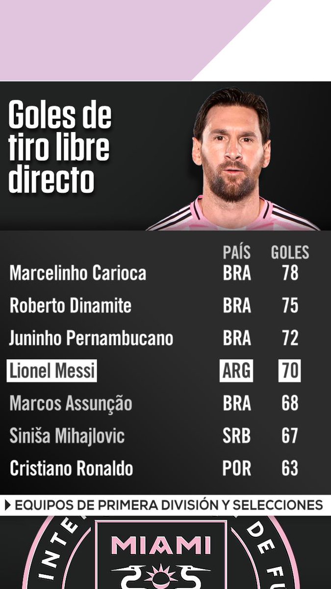 Com sua obra de arte para selar seu duplo gol no clássico contra o Orlando City, Leo Messi alcançou a marca de 70 gols de falta em sua carreira. Apenas três jogadores têm mais gols de falta que ele: Juninho Pernambucano, Roberto Dinamite e Marcelinho Carioca. Poderá ele superá-los?