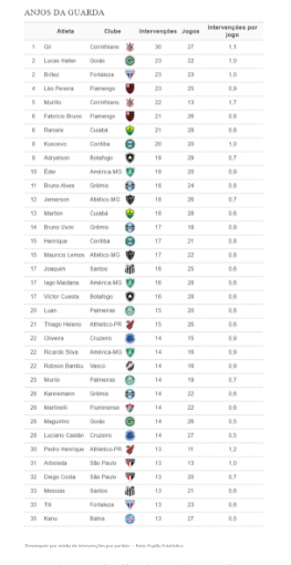 Léo Pereira é o quarto atleta que mais vezes bloqueou finalizações, 23 em 25 partidas, e Fabrício Bruno é o sexto, com 21 interceptações em 26 jogos. Veja abaixo como está o ranking com os Anjos da Guarda que mais se destacaram até aqui.