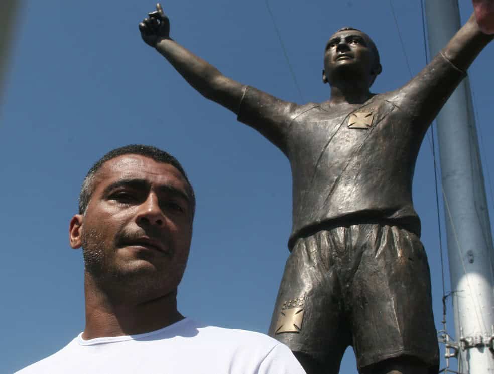 Romário e a estátua colocada na gestão do amigo Eurico Miranda: homenagem ao gol 1.000 marcado em São Januário — Foto: Agência Lance