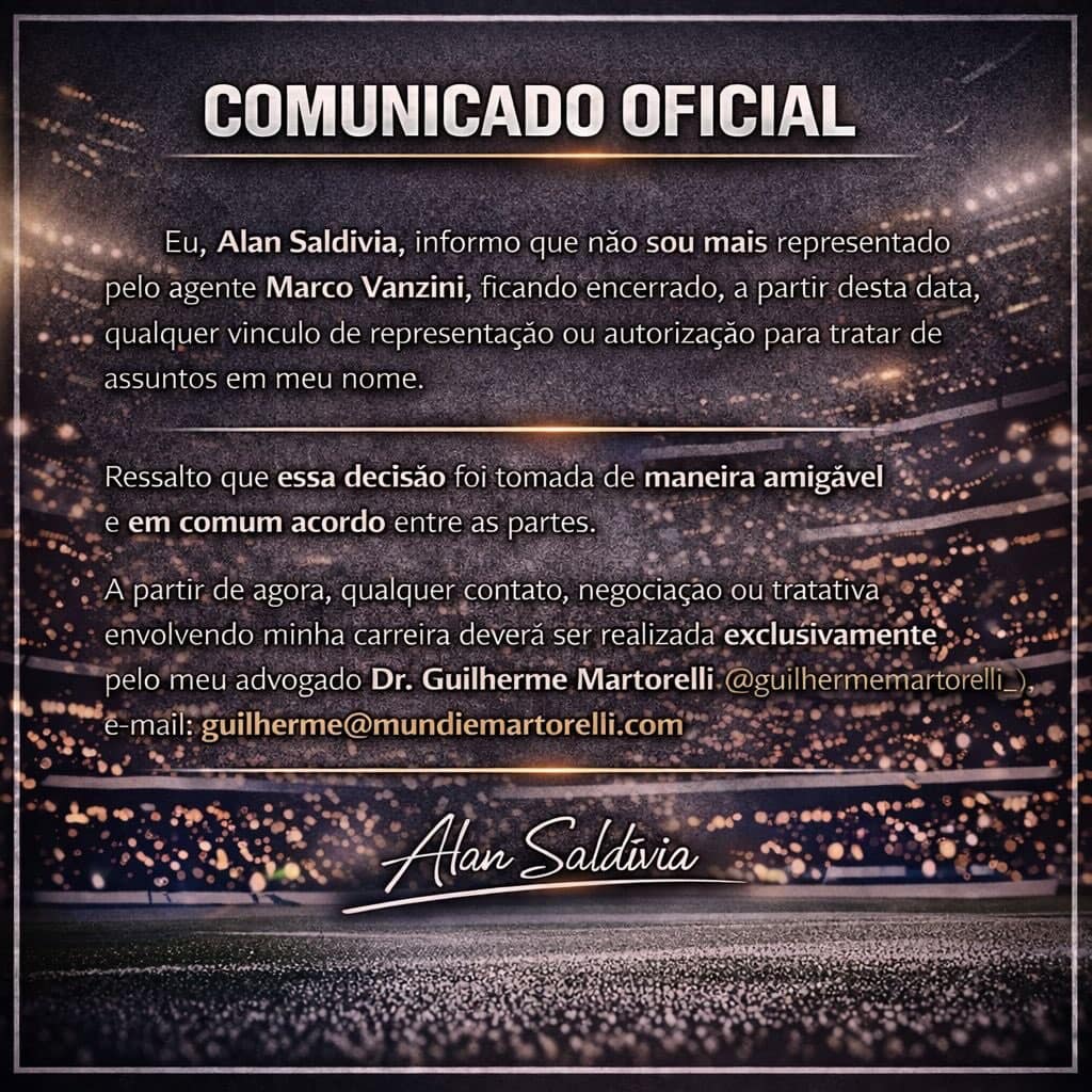 Saldivia encerra relação profissional com o agente Marco Vanzini.