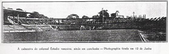 A arquibancada em curva só começou a ser construída após a inauguração do estádio, como mostram a foto (tirada em 12/06/1927) e a respectiva legenda, reproduzidos do livro “Polyanthéa Vascaina”.