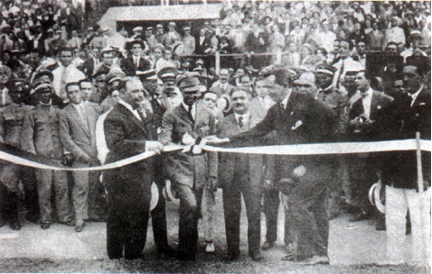 Auxiliados pelo presidente do Vasco, Raul da Silva Campos (à esquerda), o presidente da CBD Oscar Rodrigues da Costa (à direita) e o Major Sarmento de Beires (no centro) descerram a fita inaugural do Estádio Vasco da Gama.