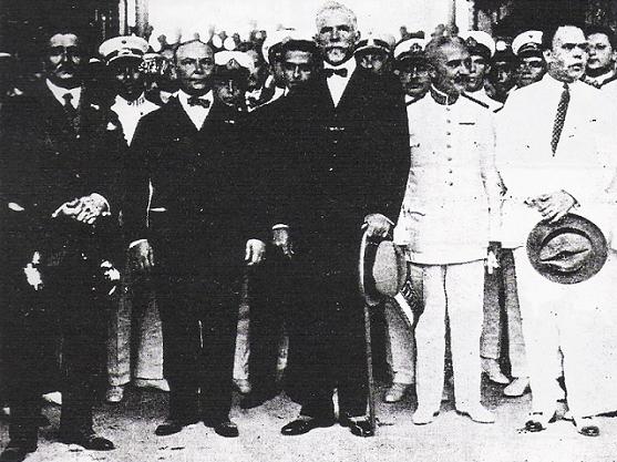 O presidente vascaíno Raul da Silva Campos (de preto) ao lado do Presidente da República Washington Luís (de bengala) e diversas autoridades.