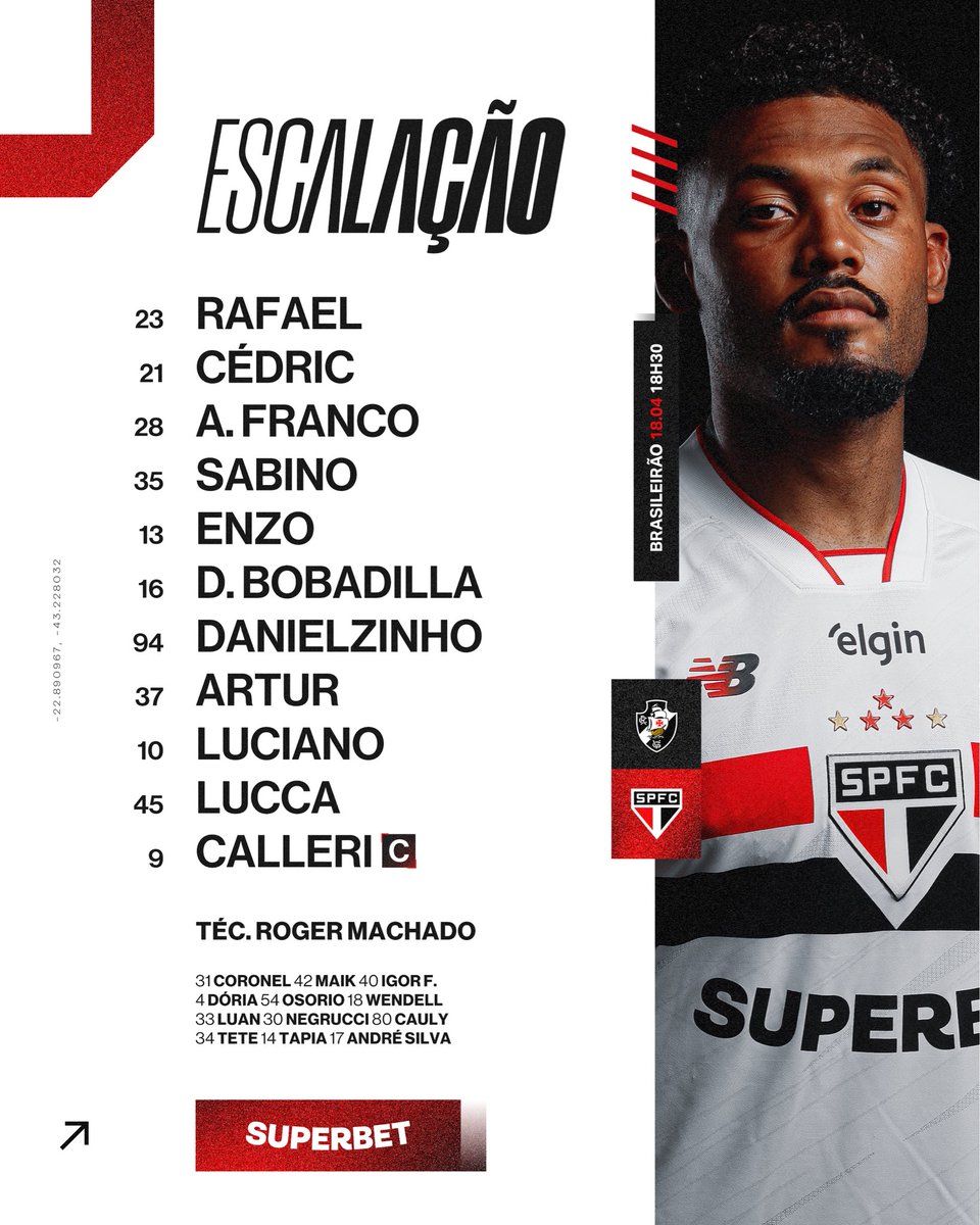 A equipe de São Paulo apresenta sua formação para o confronto contra o Vasco