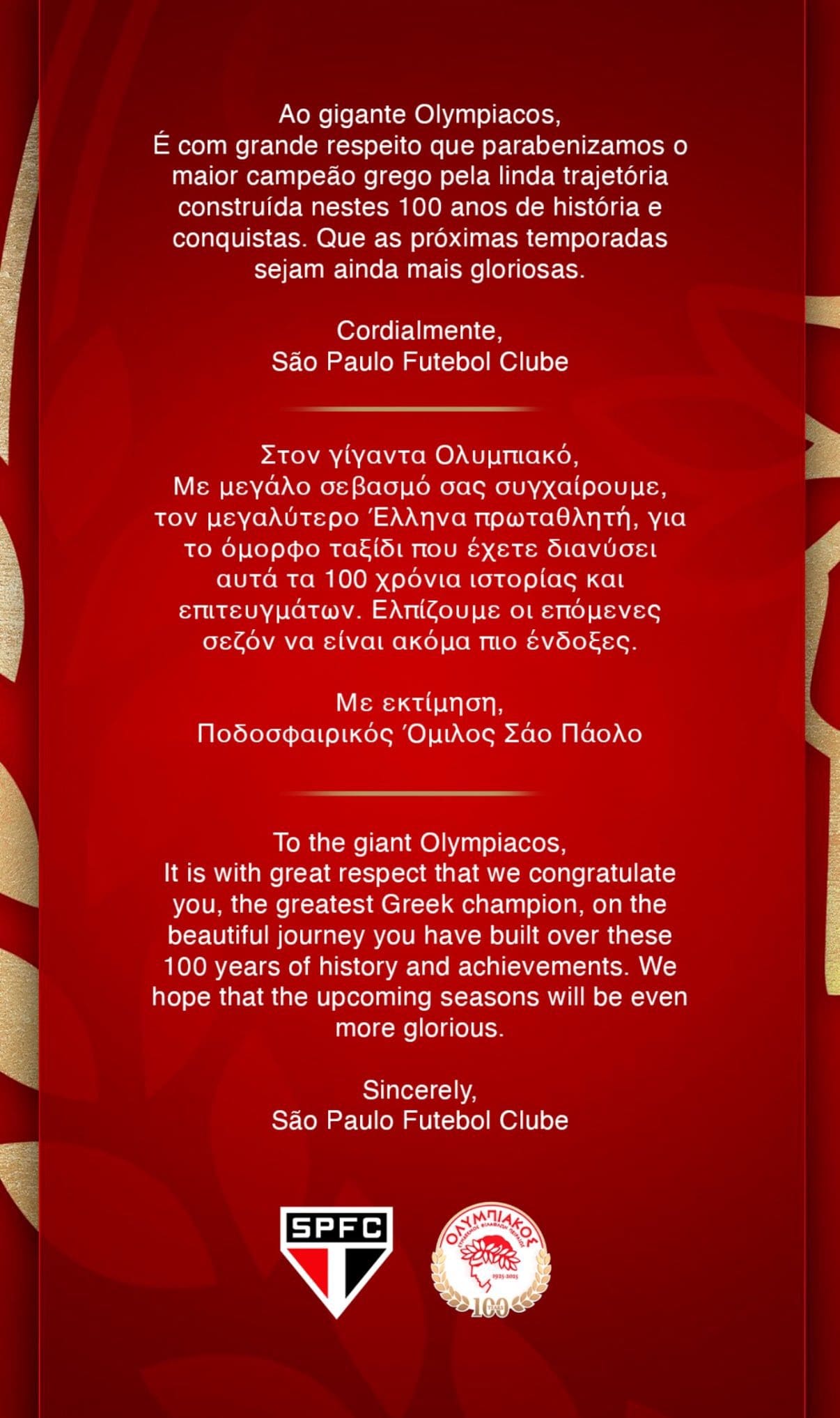 São Paulo envia congratulações de aniversário ao Olympiakos, equipe sob a administração de Evangelos Marinakis.