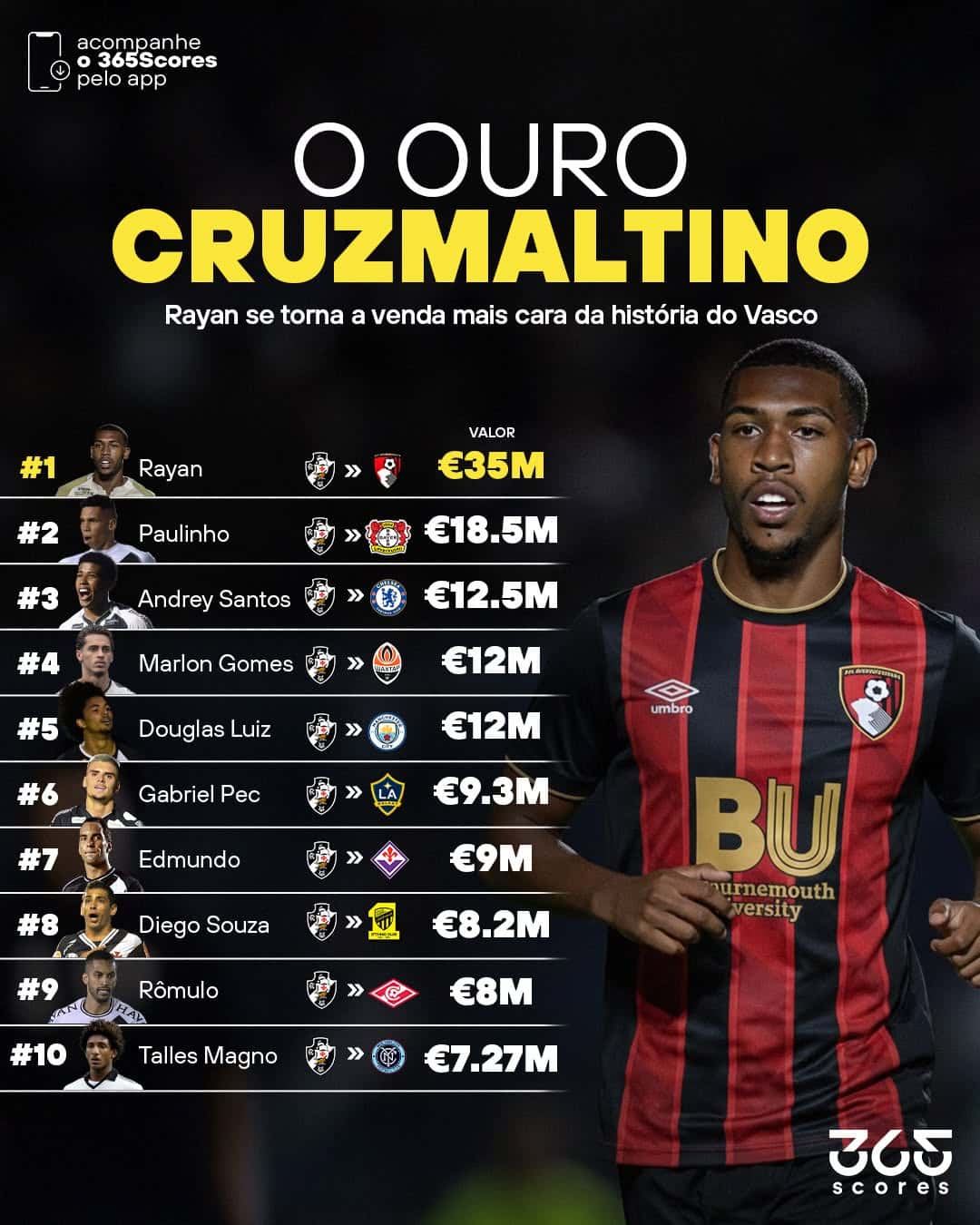 A negociação de Rayan com o Bournemouth elevou o atacante à posição de maior transferência já realizada pelo Vasco. O jovem jogador superou valores de grandes nomes como Paulinho, Andrey Santos, Douglas Luiz e Gabriel Pec, tornando-se a venda mais cara da história do clube cruz-maltino.
