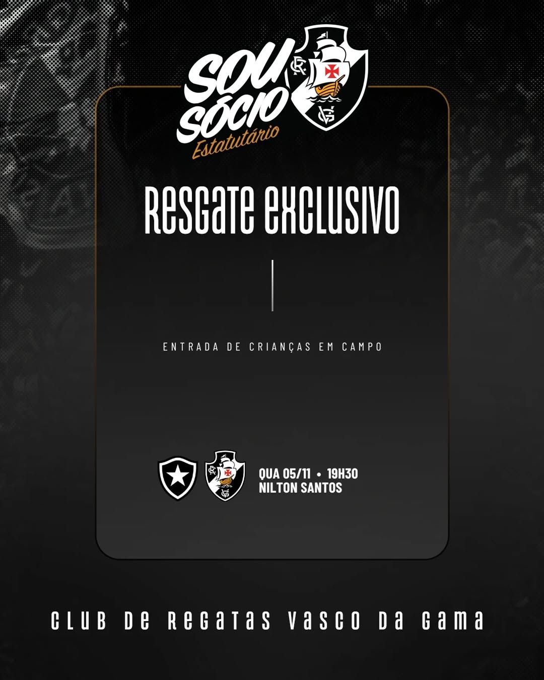 Sócios estatutários do Vasco poderão realizar resgates para a partida contra o Botafogo nesta segunda-feira a partir das 16h.