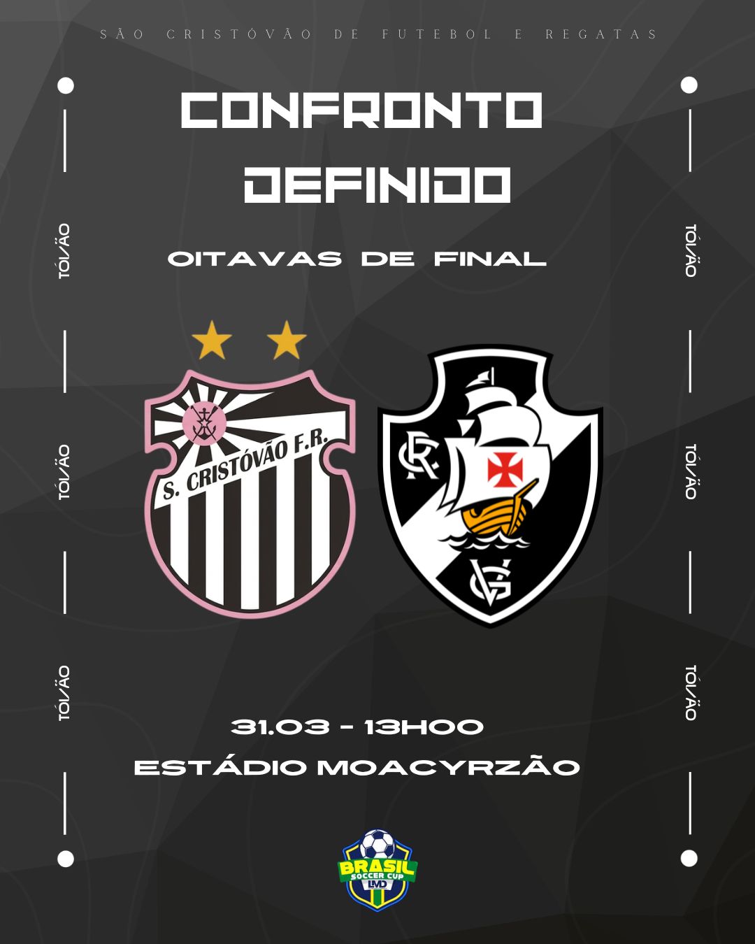 O time Sub-14 do Vasco enfrenta o São Cristóvão nas oitavas da Brasil Soccer Cup, com transmissão ao vivo no YouTube.