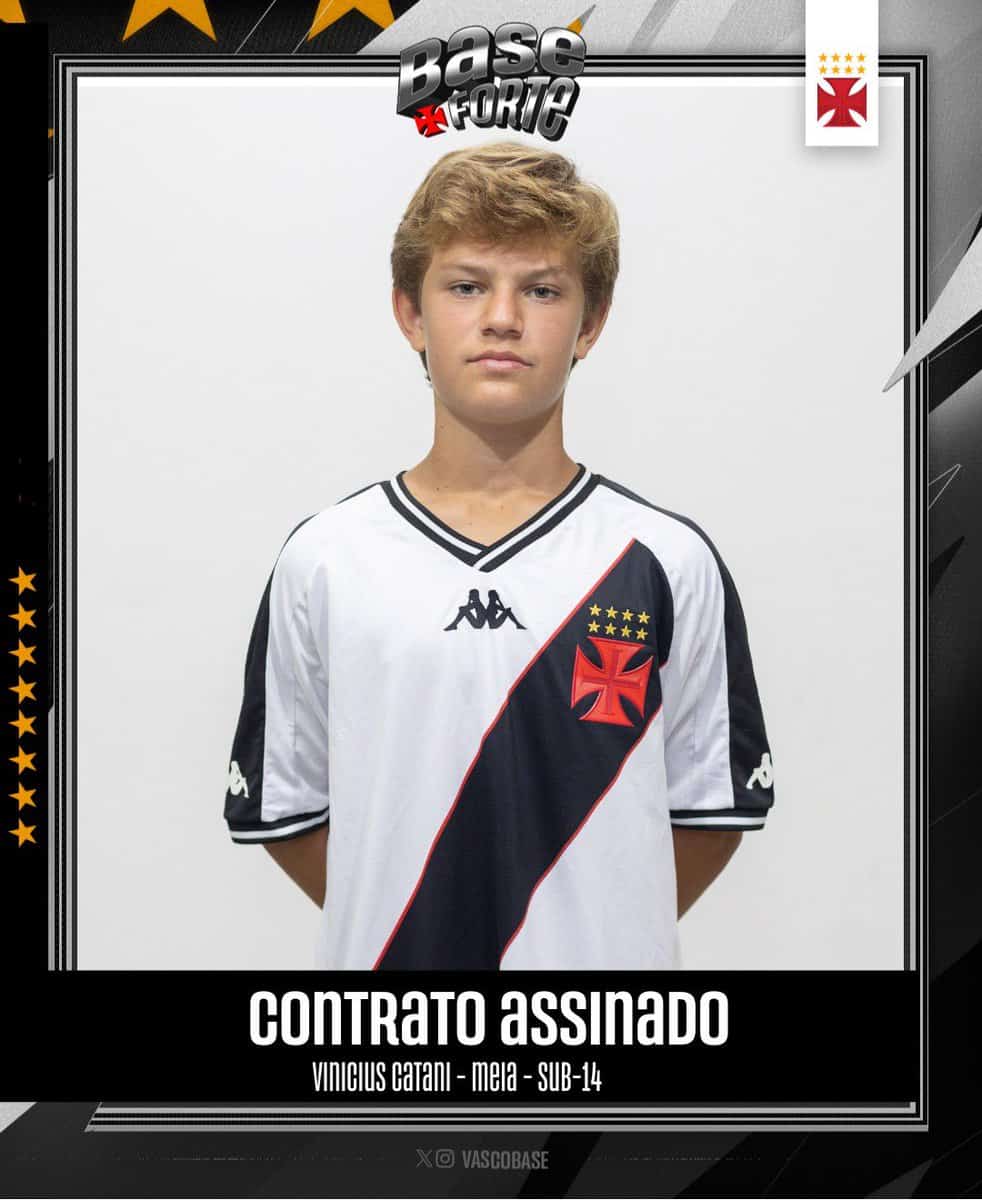 O Vasco da Gama anunciou a assinatura de um contrato de formação com o meia Vinicius Catani, que atua na categoria Sub-14. Este acordo representa um significativo passo no aprimoramento do projeto de formação de jovens talentos da base cruzmaltina.