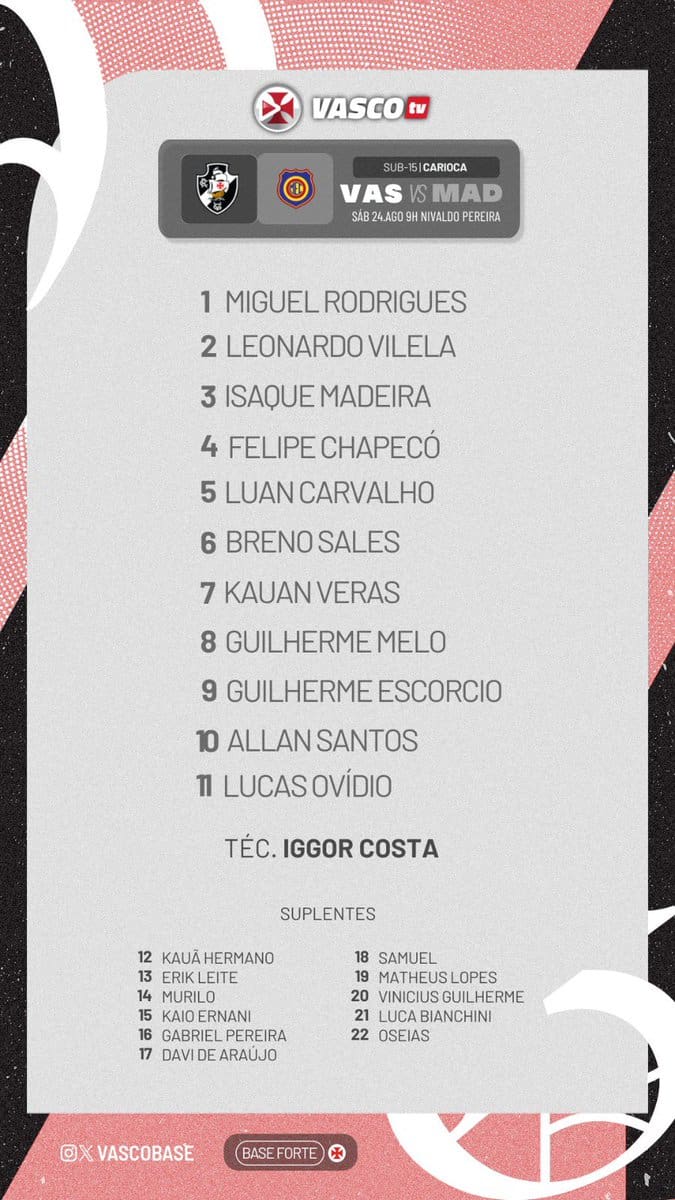Acompanhe na VascoTV a escalação do Sub-15 para o confronto contra o Madureira pelo Carioca.