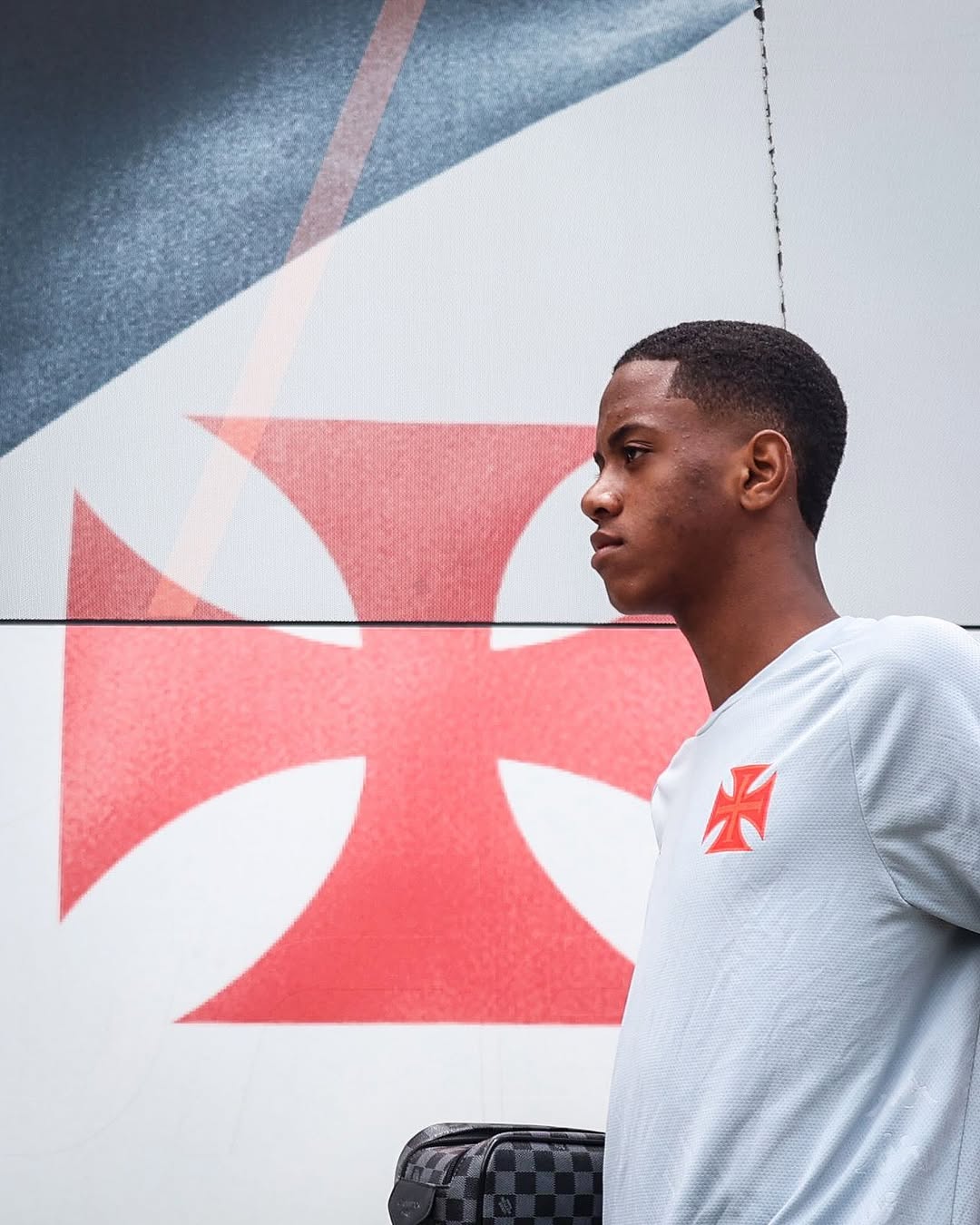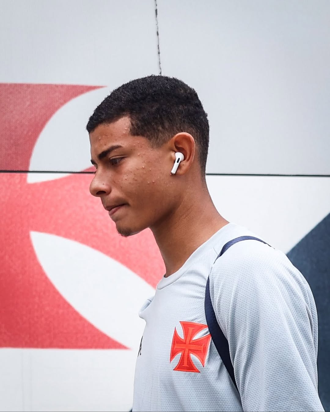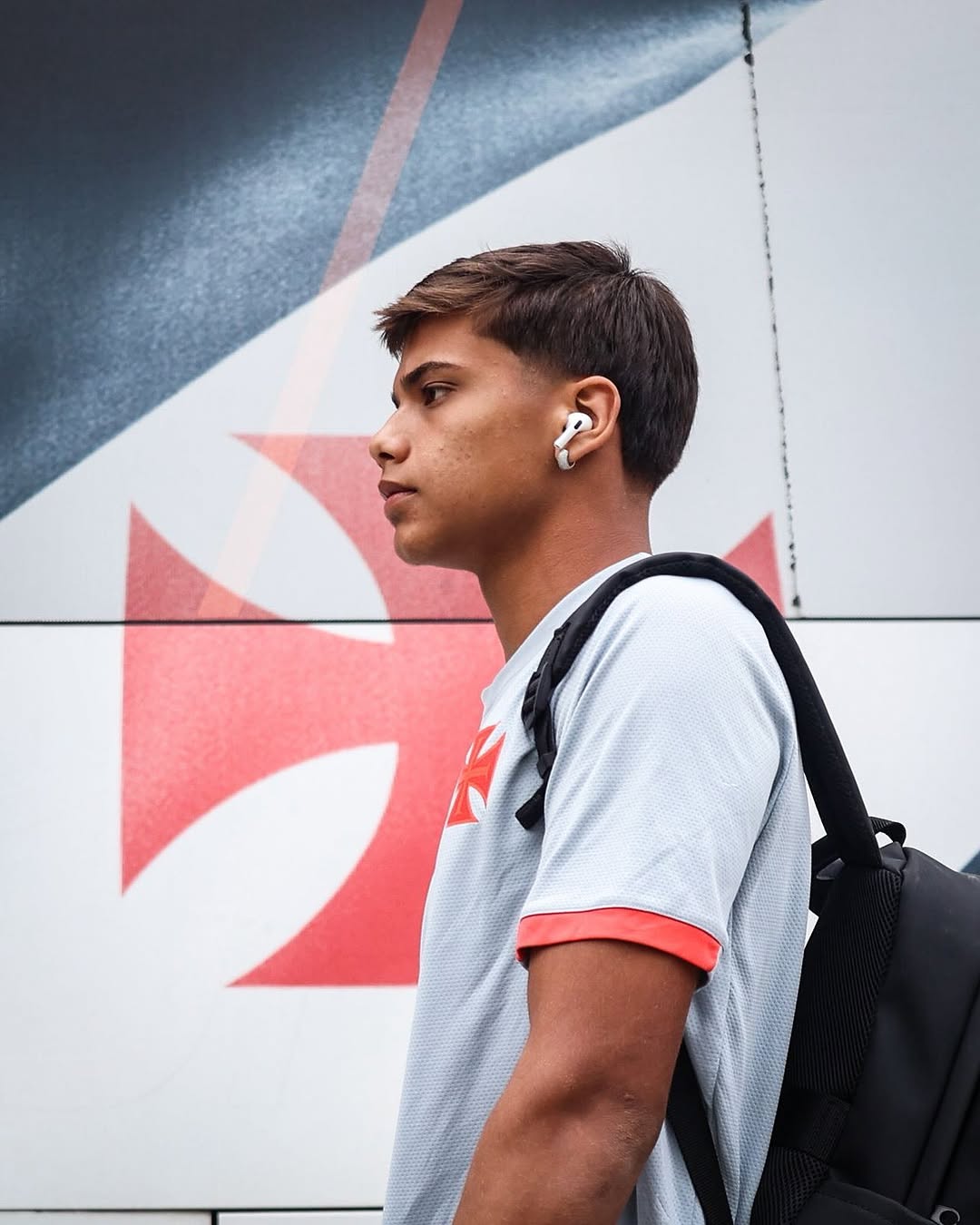 Jogador do Vasco em perfil com logo ao fundo. Ragazzo de perfil com camisa branca, fundo com logo do Vasco da Gama. Jogador de futebol com mochila e fone de ouvido. Jogador do Vasco de costas, camisa branca com escudo vermelho. Cabeludo do jogador do Vasco com fone de ouvido branco.