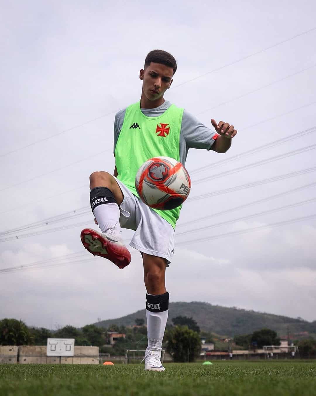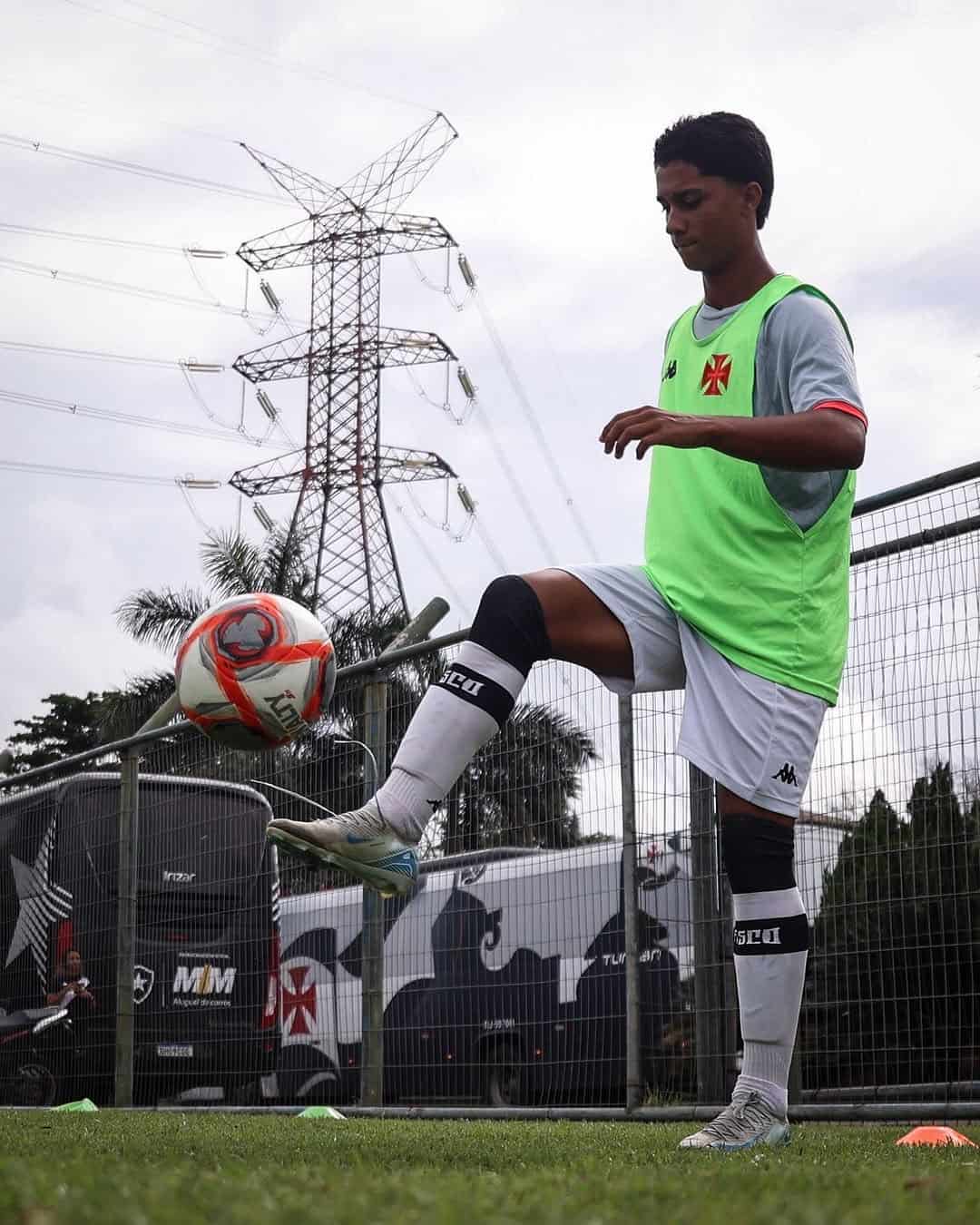 Futebol do Vasco durante treino na grama. Atleta treinando no campo com uniforme do Vasco. Criança treinando futebol com bola em campo. Jogador do Vasco treinando com bola.