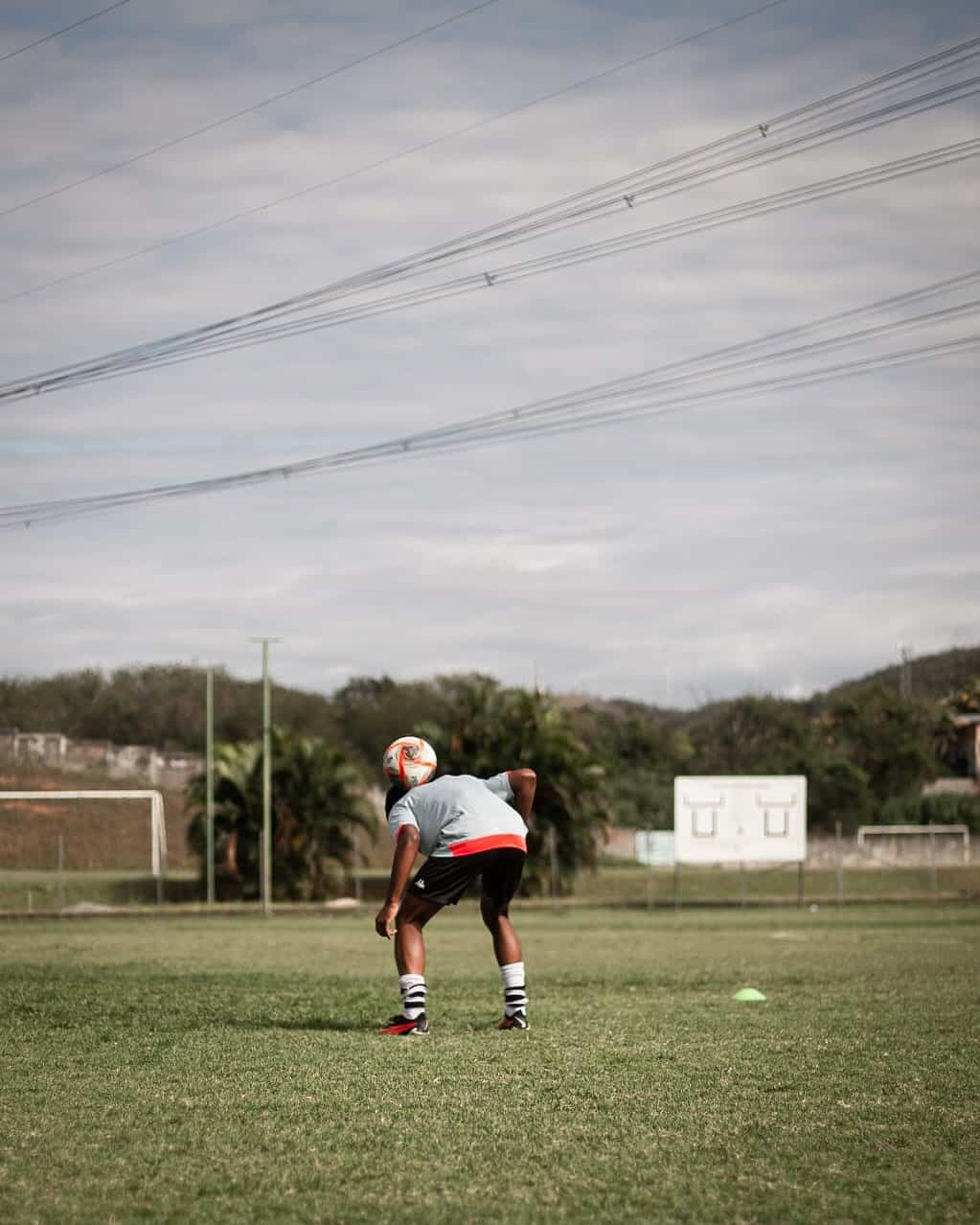 Crianças treinando futebol no campo ao ar livre. Juventude jogando futebol no campo ao ar livre. Jogador treinando com bola no campo de futebol. Vasco da Gama treinando no campo ao ar livre.