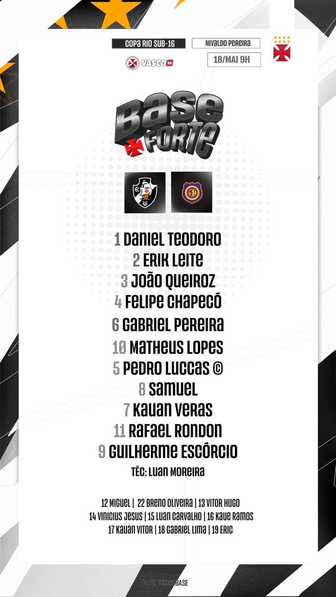 A conta Vasco Base @vascobase divulgou a escalação do time Sub-16 para a 4ª rodada da Copa Rio, onde enfrentará o Madureira.