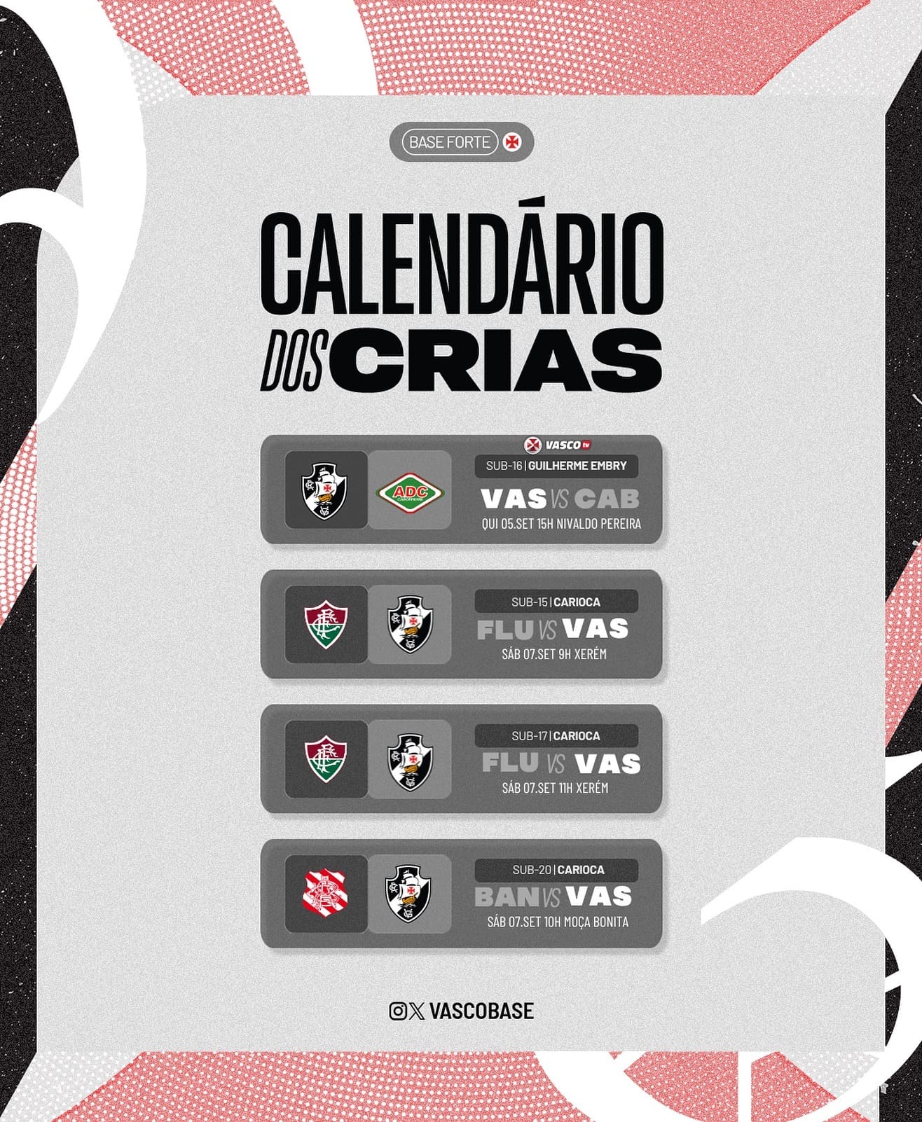 ➡️ No sábado, as categorias Sub-15 e Sub-17 jogam contra o Fluminense fora de casa pelo Campeonato Carioca. Além disso, o time Sub-20 disputa a primeira partida das quartas de final do estadual contra o Bangu, também fora de casa.