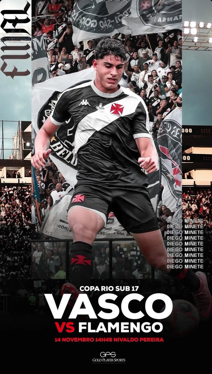 O atacante Diego Minete se junta ao time Sub-17 como reforço para a partida de volta da final da Cop Rio contra o Flamengo. O duelo ocorrerá nesta sexta-feira, às 14h45, no estádio Nivaldo Pereira. No primeiro confronto, o Vasco foi derrotado por 2 a 1 na Gávea. A equipe precisa vencer por pelo menos um gol para levar a disputa aos pênaltis.