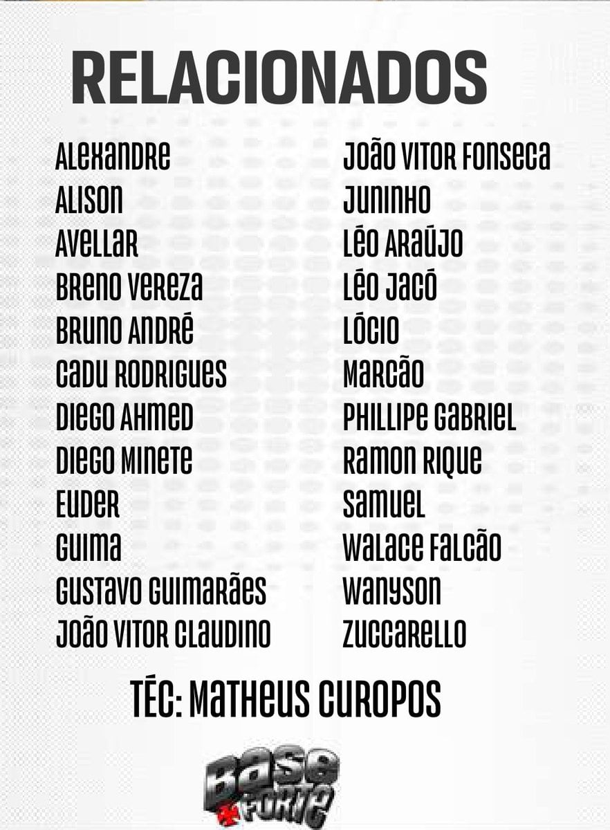 Os jogadores estrangeiros Santos (Venezuela) e Brayan Grance (Paraguai) não foram incluídos na lista de relacionados por escolha técnica. Estou propondo a seguinte escalação: Philippe Gabriel, Breno, Bruno André, Wallace e Avellar; Samuel, Euder e Zuccarello; Juninho, Lócio e Léo Jacó.