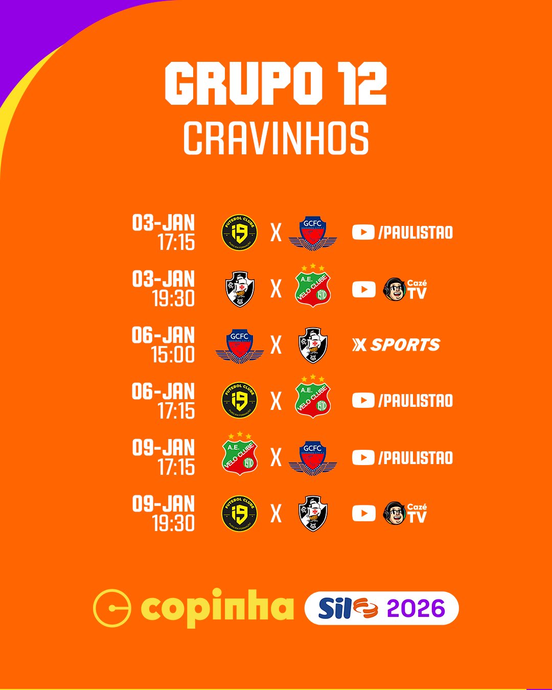 Sub-20: Vasco inicia sua participação na Copinha em 3 de janeiro, às 19h30, enfrentando o Velo Clube com transmissão da CazéTV.