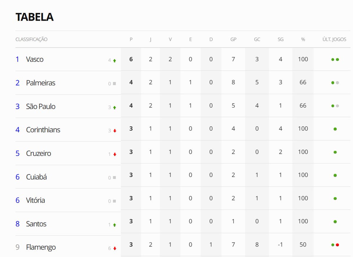 Com os resultados até o momento, o Vasco se destaca como o único clube a conquistar duas vitórias em dois jogos no Campeonato Brasileiro Sub-20. A equipe obteve uma expressiva vitória sobre o Flamengo, com um placar de 4 a 1. Na próxima rodada, enfrentará o São Paulo, no Nivaldo Pereira. Confira a classificação: